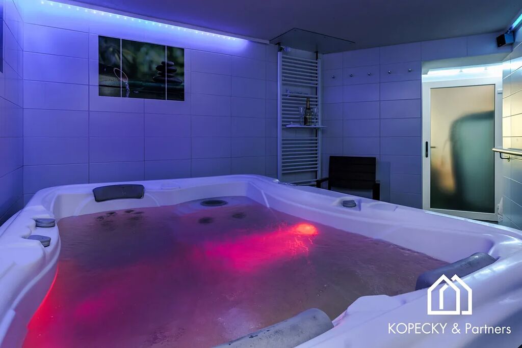 Nemovitost nabízí soukromé wellness s vířivkou a saunou pro dokonalou relaxaci. Venku se nachází vyhřívaný bazén s protiproudem, udržující teplotu na příjemných 30 °C, což umožňuje koupání po celý rok. Pro milovníky zimních sportů je na pozemku k dispozici lyžařský vlek ideální pro začátečníky.