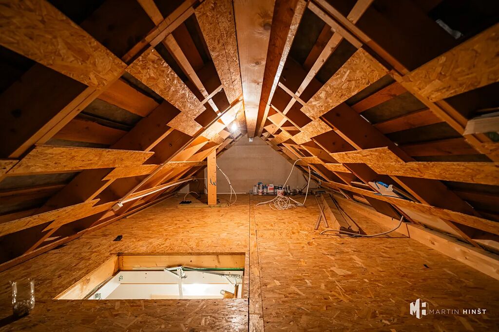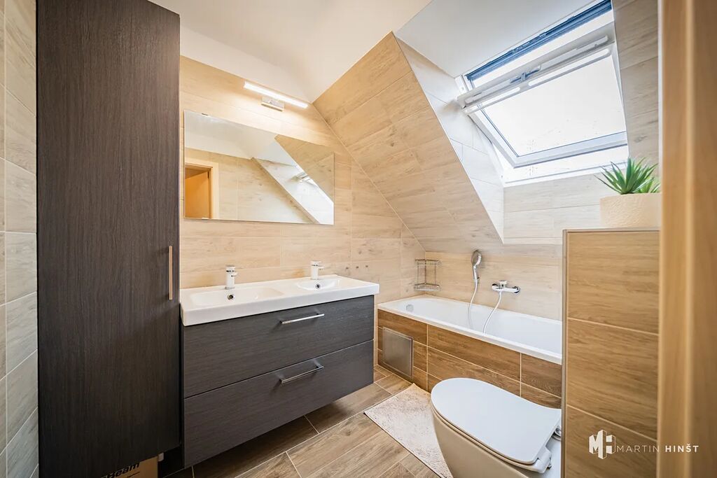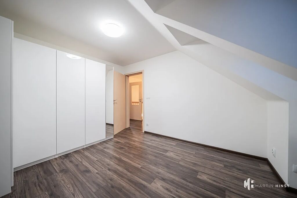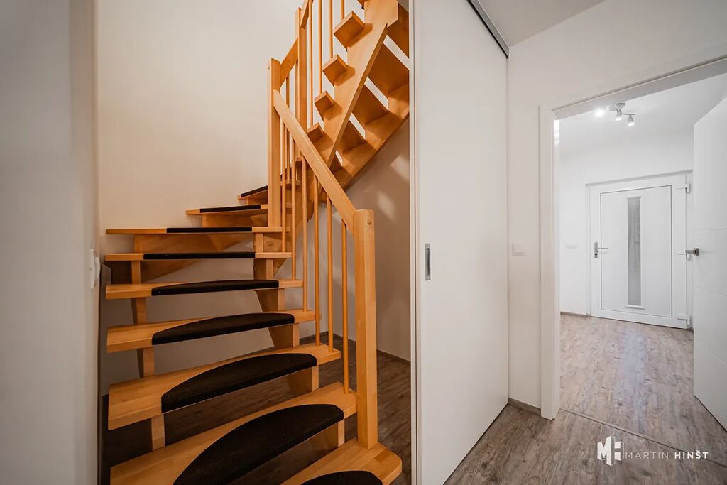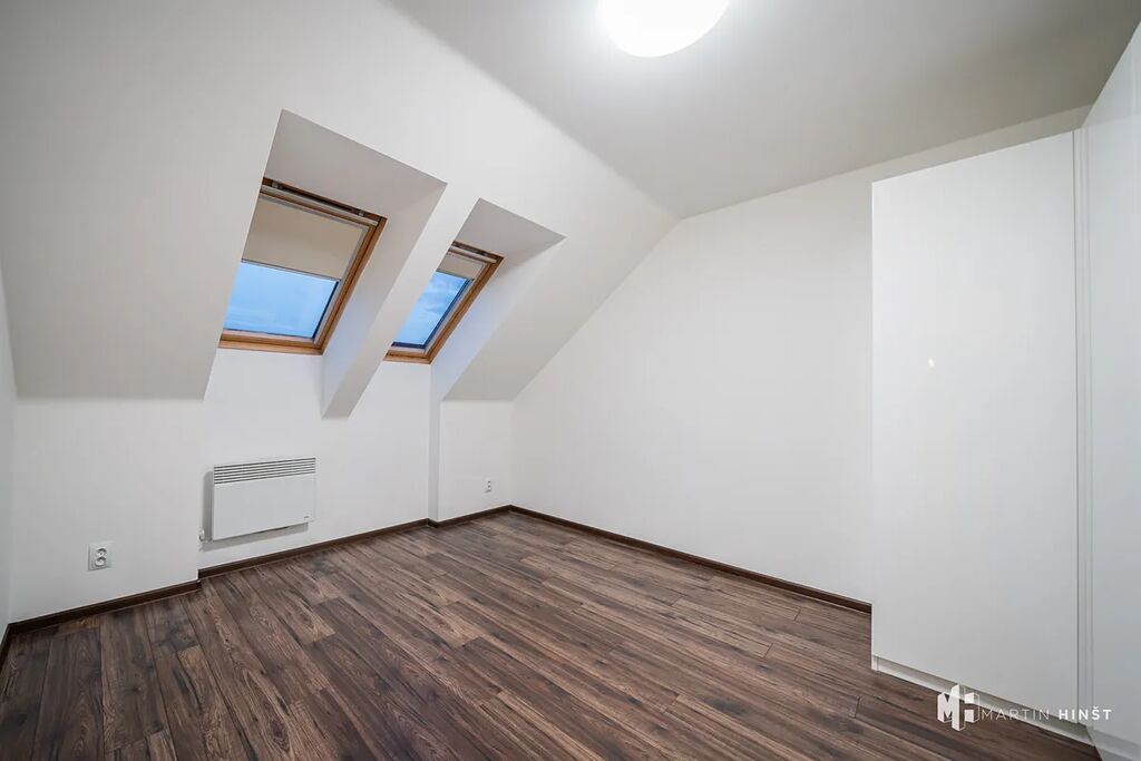 Po dřevěném schodišti se dostanete do druhého patra, kde jsou dva samostatné pokoje, šatna, koupelna s vanou a WC a praktická komora. K dispozici je také půda s velkým úložným prostorem. Ve spodním patře je podlahové vytápění a v horním patře přímotopy. Ohřev teplé vody je řešen bojlerem. Dům se pronajímá nezařízen nábytkem.