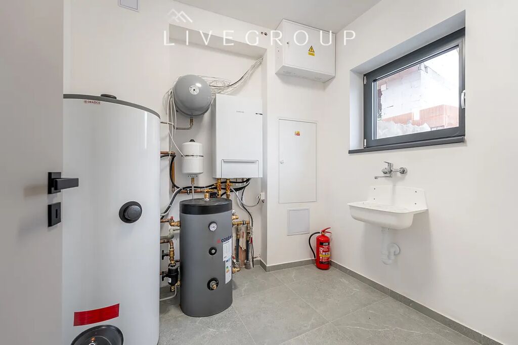 Dům je vybaven podlahovým teplovodním vytápěním a centrální klimatizací s přípravou regulace do každé místnosti samostatně. Hliníková okna s izolačním trojsklem, venkovní žaluzie s elektrickým pohonem na všech oknech ovládané přes mobilní aplikaci, centrální systém ovládání domu a bezpečnostní systém s kamerovým dohledem přispívají k bezpečnosti i efektivnímu hospodaření s energií. Interiér je vybaven prémiovými materiály, včetně vinylových podlah, keramických obkladů a vnitřních designových dveří se zvýšeným akustickým tlumením. O efektivní vytápění se stará tepelné čerpadlo, stejně jako o ohřev užitkové vody z nádrže na 300 litrů, které se vyznačuje úsporným provozem. Dům disponuje retenční nádrží.