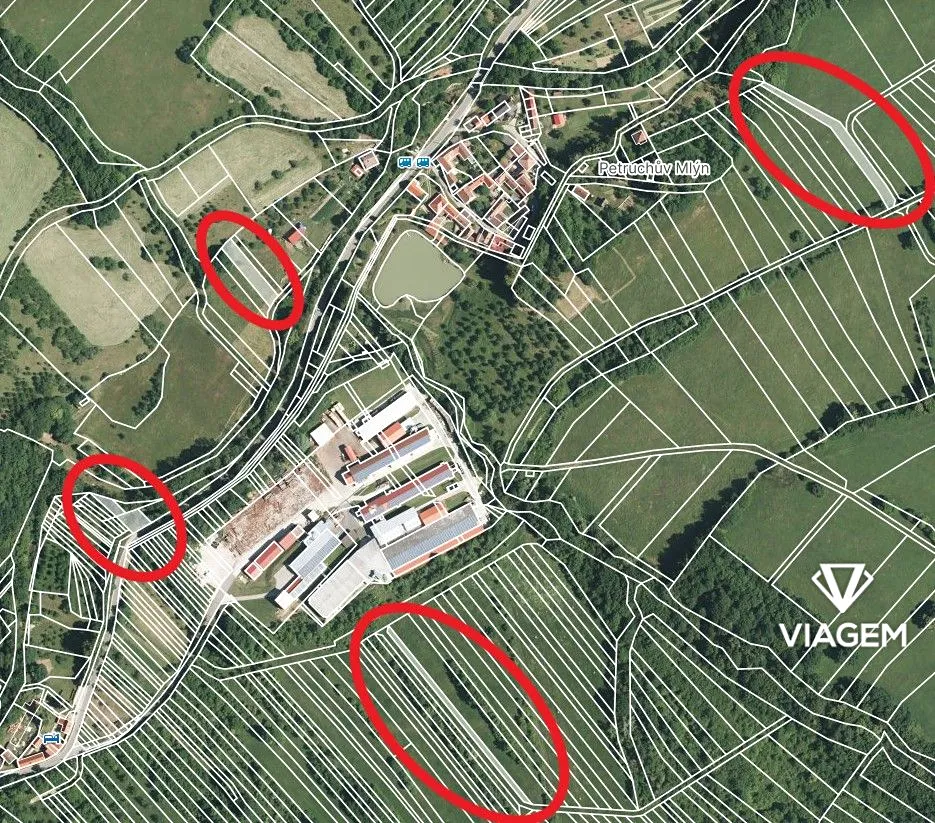 • Parcelní čísla a výměry: 887/1 – 170 m², 887/2 – 279 m², 7482 – 623 m², 8376 – 704 m², 8543 – 1 002 m²