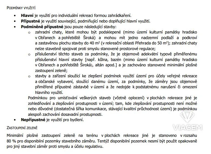Pozemky se dle územního plánu nacházejí v plochách určených pro individuální rekreaci (zahrádkaření). Hlavní využití je rekreační, podmíněně přípustná je výstavba zahradní chaty do 40 m² zastavěné plochy (jedno nadzemní podlaží a podkroví) a drobného příslušenství (kůlna, bazén, gril apod.), za dodržení stanovených podmínek regulace a podílu zeleně.