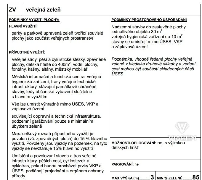 Povolena výstavba drobných objektů do 30 m² (např. zázemí nebo hygienické zařízení do 10 m²). Celková zastavitelnost do 15 % plochy.