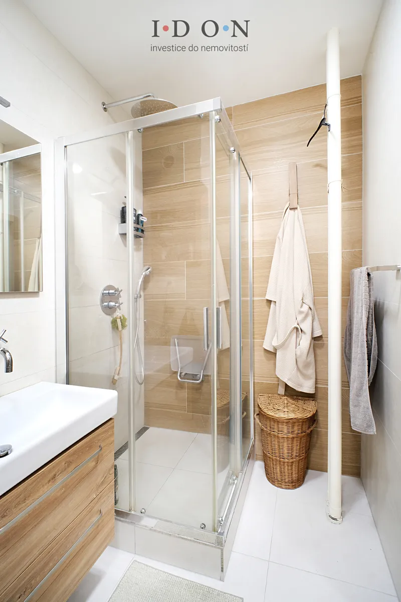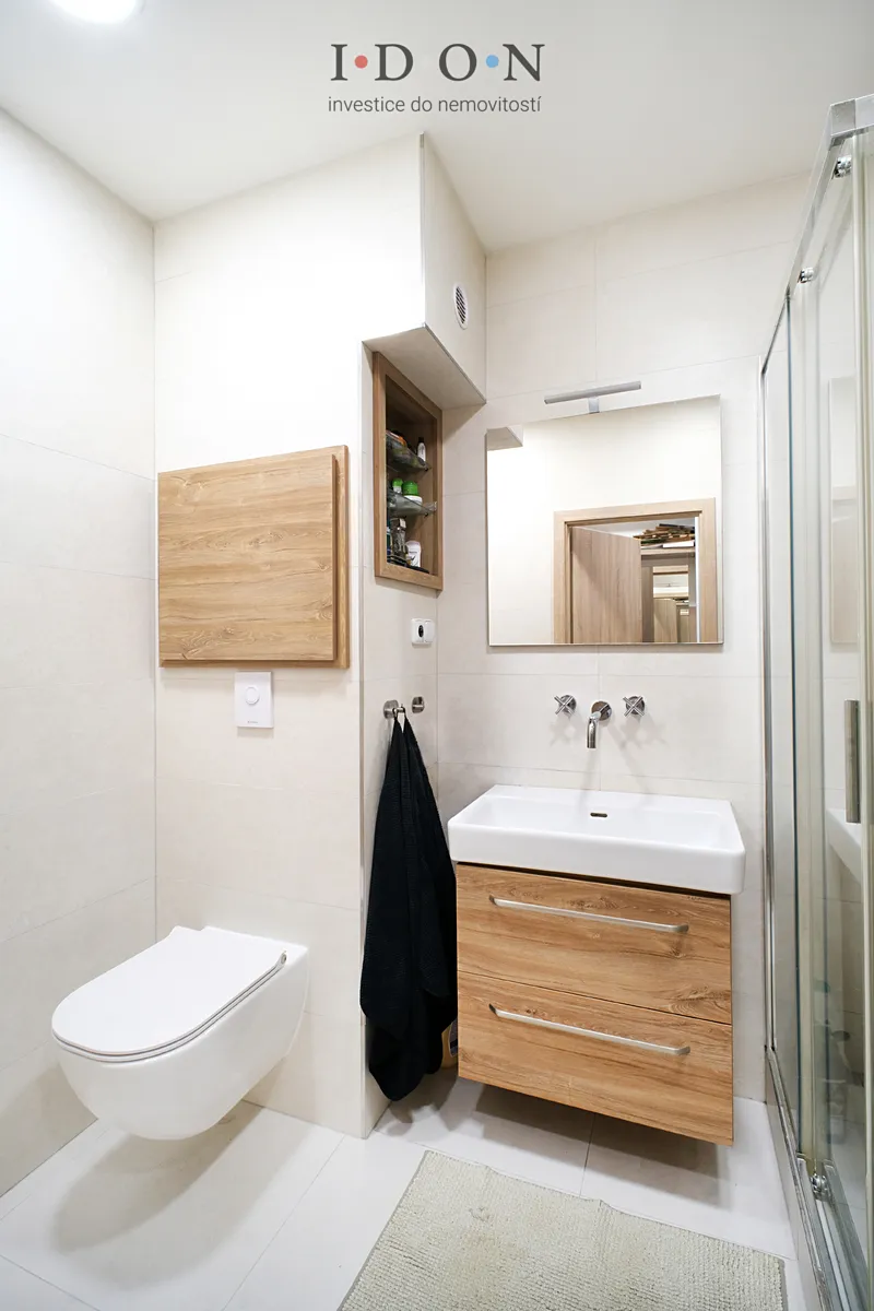 Koupelna byla velkoryse zvětšena a kompletně předělána – disponuje moderním sprchovým koutem a elegantním designem, součástí koupelny je WC.