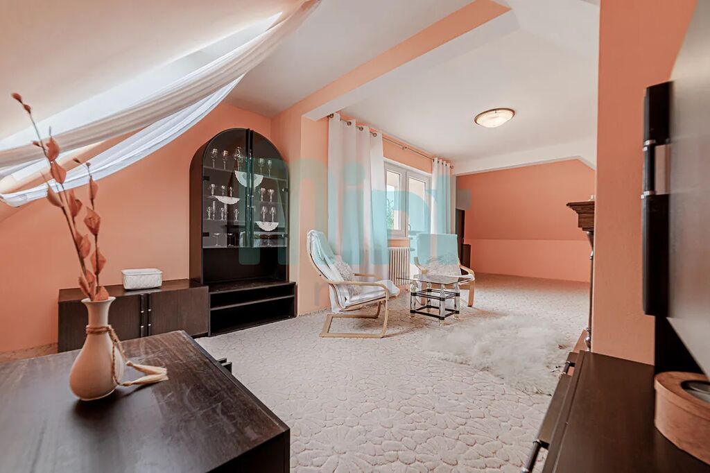 V prvním patře najdete tři samostatné pokoje a prostornou koupelnu s toaletou a vanou. Třetí pokoj disponuje balkonem, ze kterého se otevírá krásný výhled na jihovýchod, jih a jihozápad. Přízemí a první patro jsou propojené otevřeným schodištěm