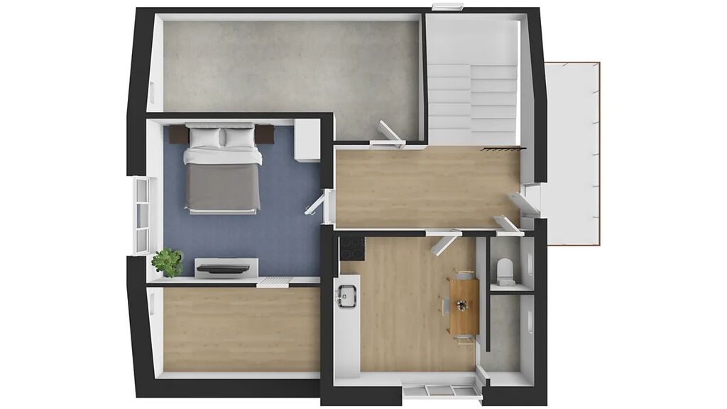 * Přízemí: prostorný obývací pokoj s krbovými kamny, samostatná kuchyň, ložnice, koupelna a samostatné WC.