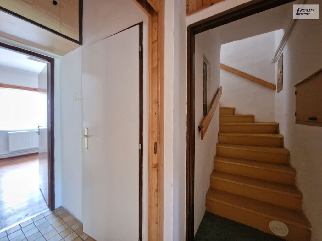 V podkroví domu cca 75 m2 plochy: schodiště, chodba, koupelna s vanou, samostatné WC kombi, kuchyně s jídelnou vč. vchodu na lodžii s orientací do zahrady, obývací pokoj, dětský pokoj a ložnice.