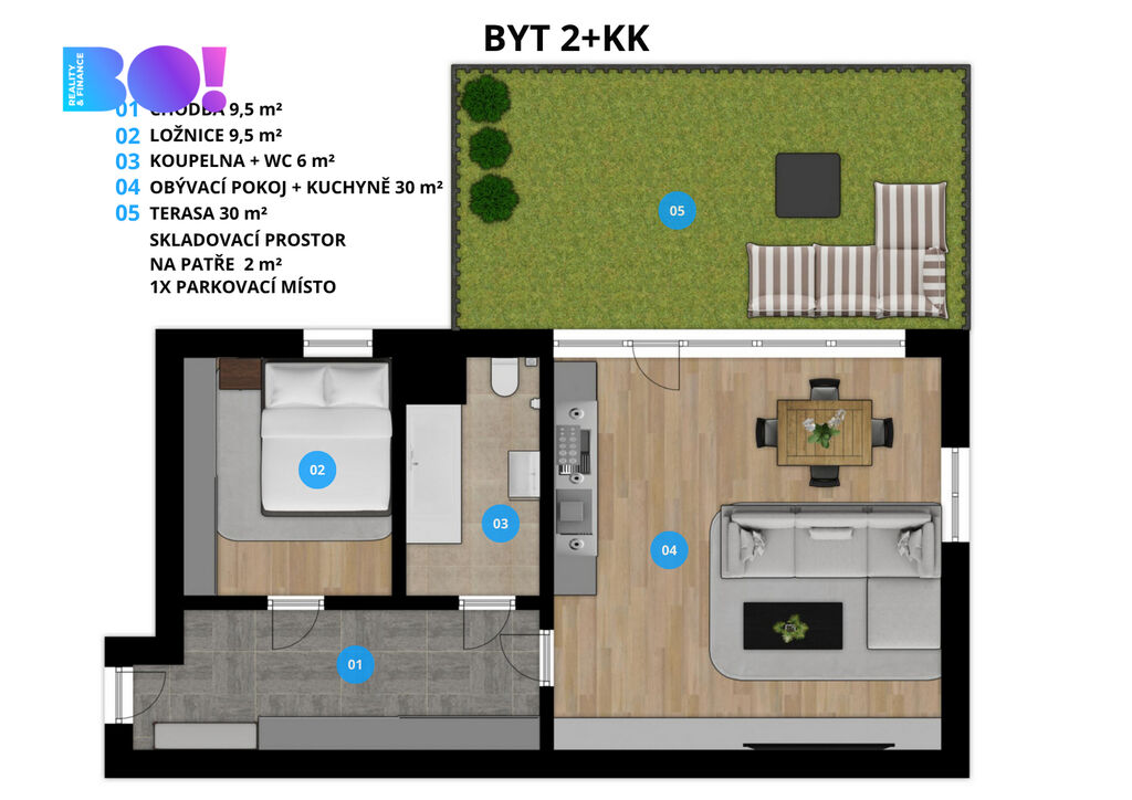 Terasa: 30 m² (skvělá pro odpočinek, gril i bylinkový koutek).