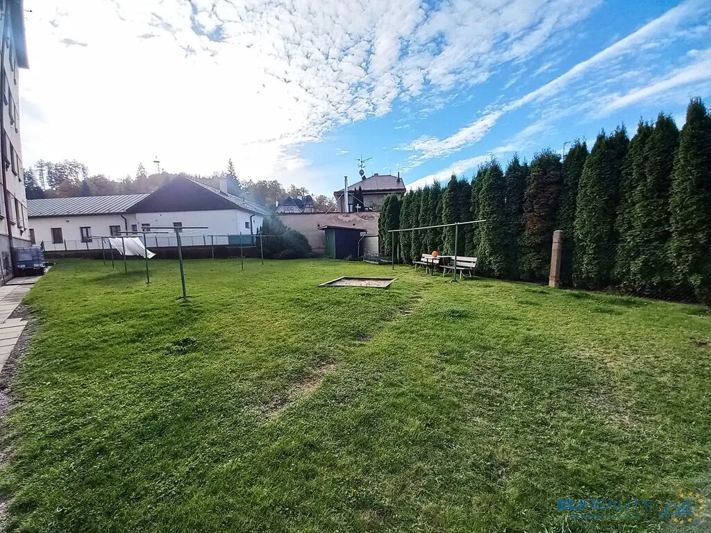 Okolo domu společný dvůr, zahrada s pískovištěm.