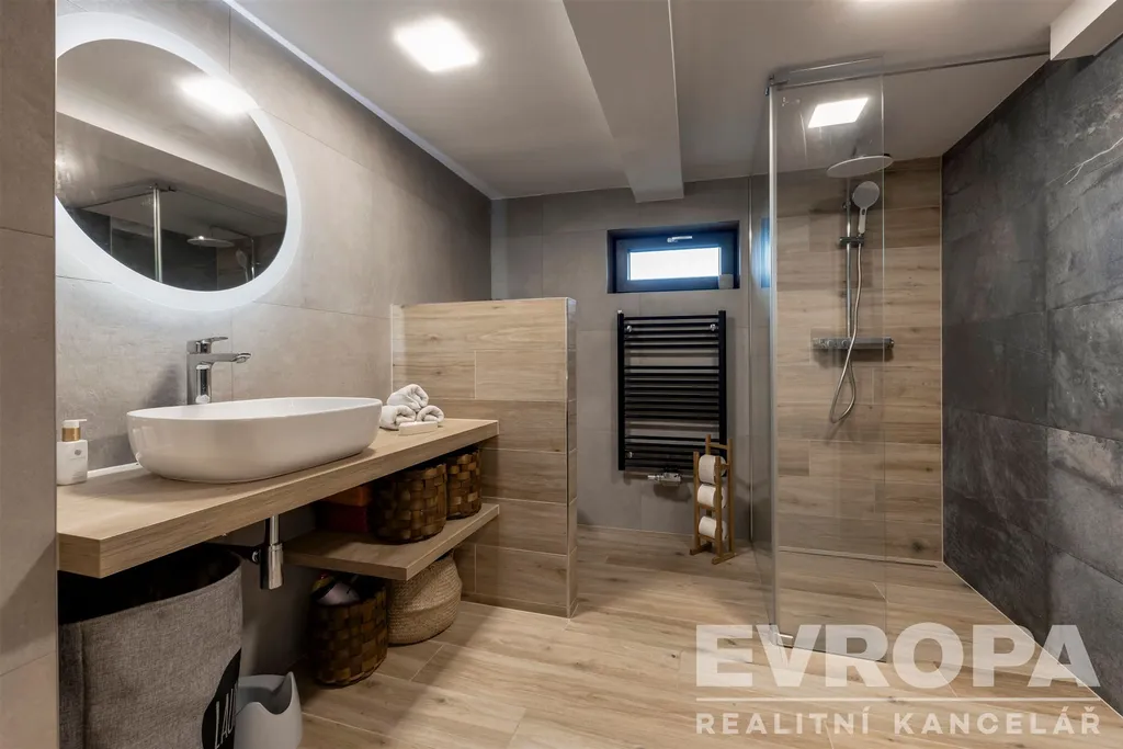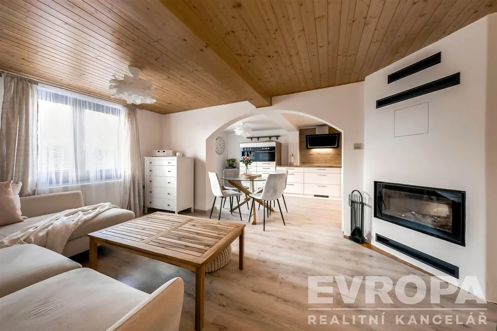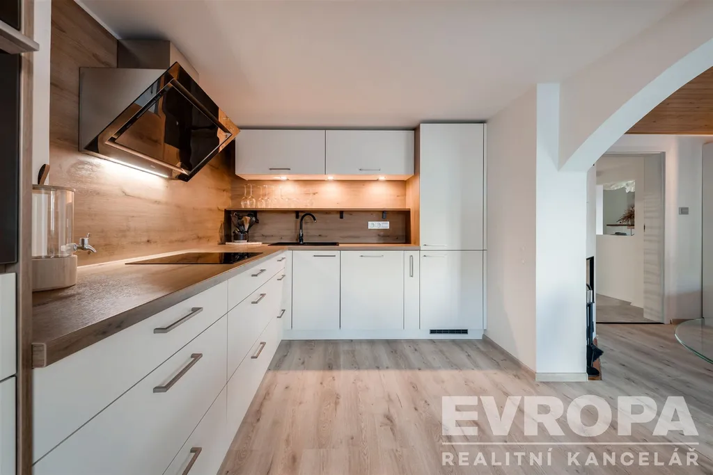 Interiér je dokonalým propojením dřeva, doplněné o designovou dlažbu, luxusní spotřebiče a hlavně je zde na každém kroku cítit otisk vkusného a praktického využití každého koutu.