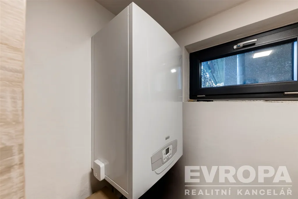 Vytápění je řešené kombinovaným plynovým kotlem s ohřevem vody. V obývacím pokoji je moderní krbová vložka s pomalým hořením a horkovzdušným rozvodem do domu. V místnostech jsou umístěna topná tělesa a v koupelně je podlahové vytápění a elektrický žebřík. Do domu je přivedena obecní voda a odpad je svedený do septiku.