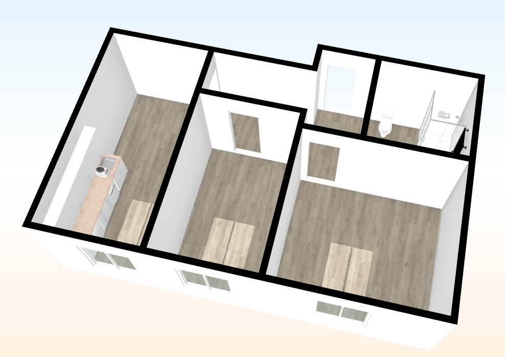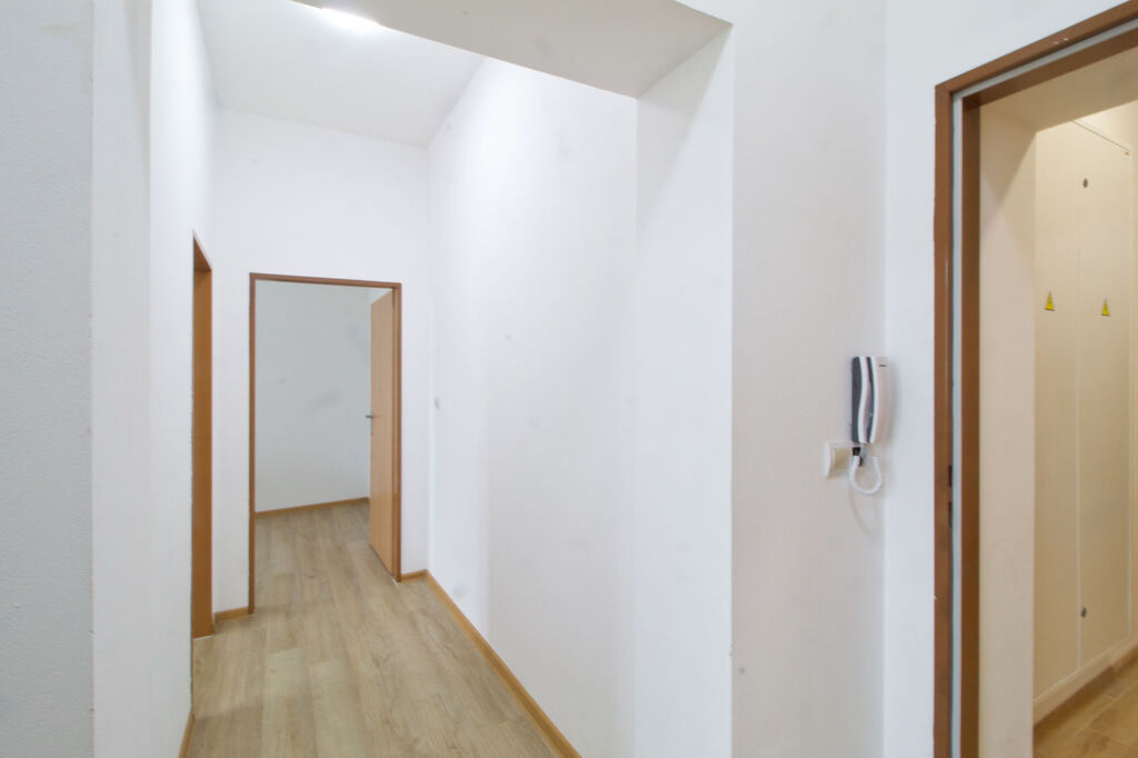 Byt je situován v 1. nadzemním podlaží cihlového domu. Kuchyně (13 m²) je vybavena kuchyňskou linkou s troubou a sklokeramickou varnou deskou. Koupelna (5,2 m²) je vybavena sprchovým koutem, závěsným WC, přípojkou na pračku, umyvadlem se skříňkou a topným žebříkem. Pokoje jsou velké 14 m² a 9,8 m² a jsou neprůchozí. Oba pokoje jsou přístupny z předsíně. V bytě jsou položeny plovoucí podlahy v pokojích a dlažba v kuchyni, předsíni a koupelně.