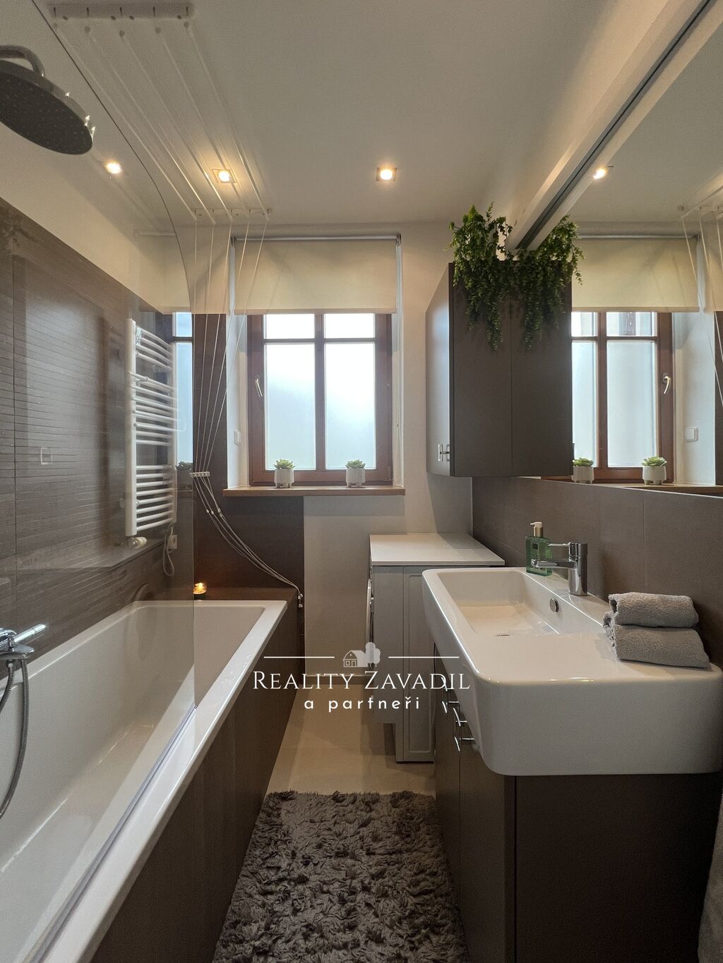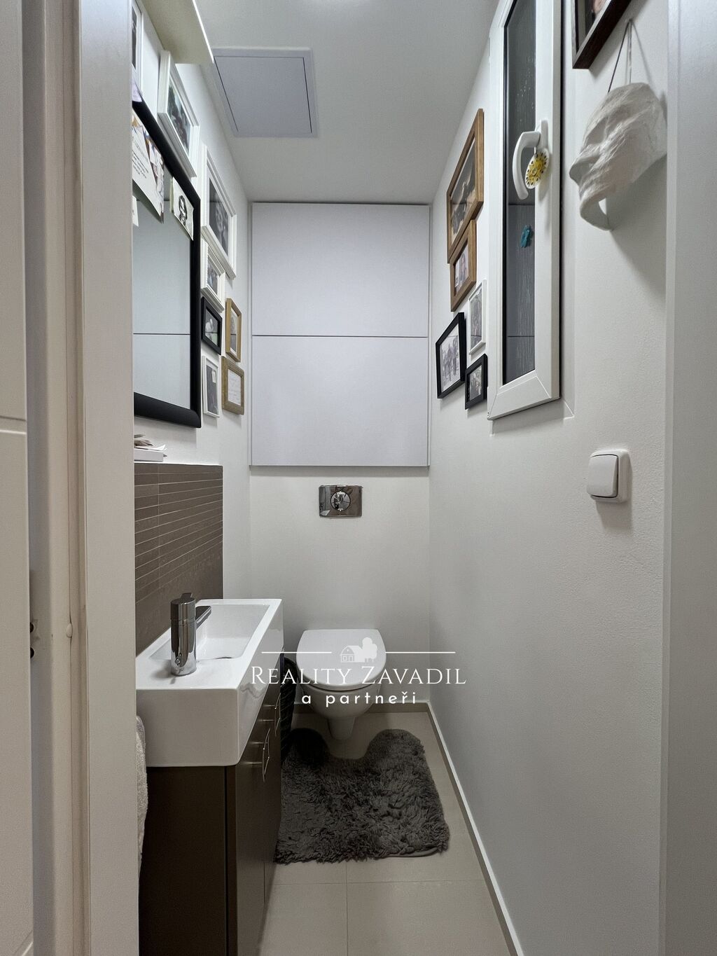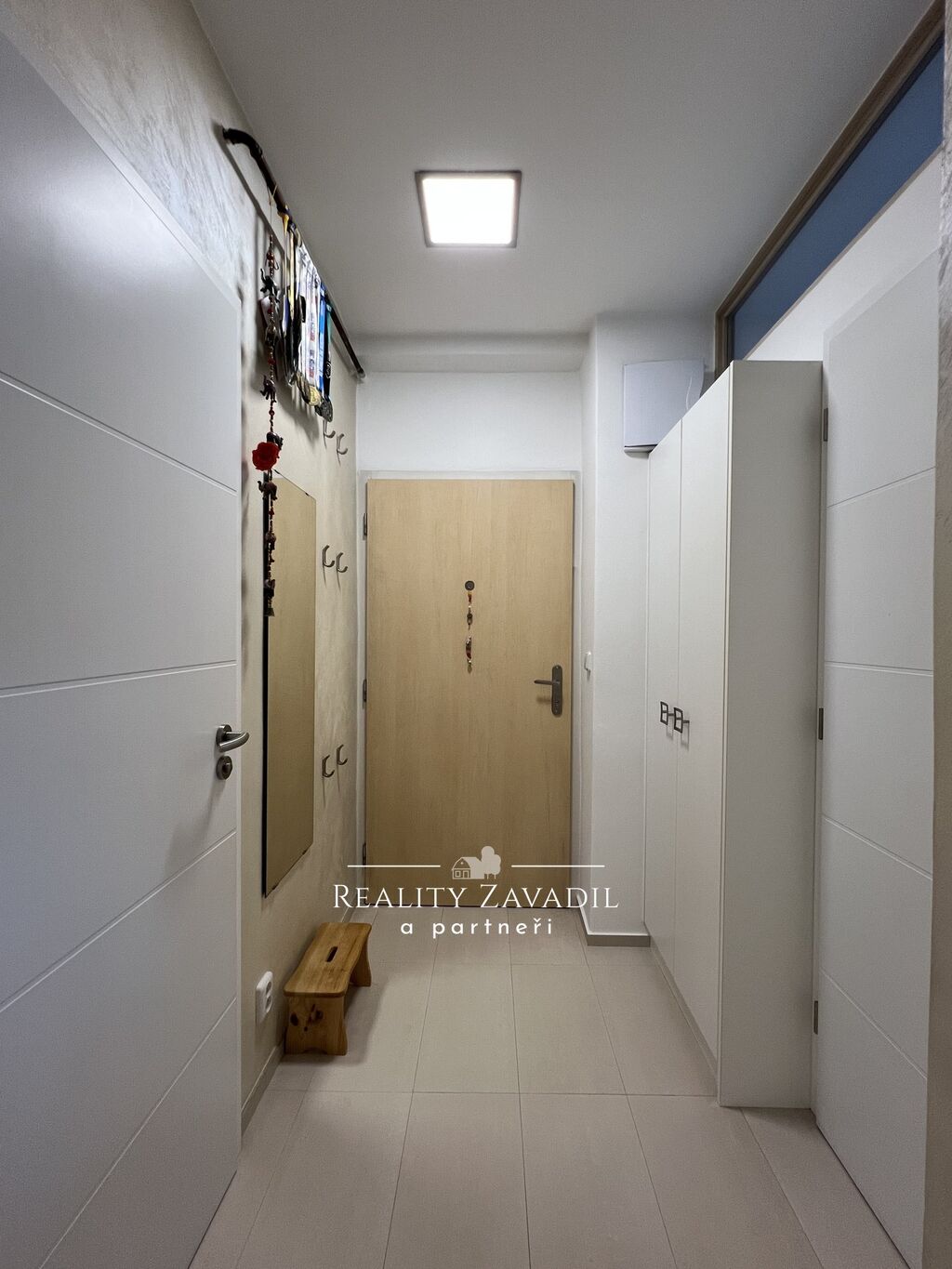Byt o dispozici 2+kk s obytnou plochou 45,7 m² disponuje zádveřím s vestavěnou skříní a koupelnou, jejíž součástí je vana, umyvadlo a pračka. Z chodby je vstup na samostatnou toaletu a dále do obývacího pokoje propojeného s kuchyní, vybavenou moderní kuchyňskou linkou včetně spotřebičů (myčka nádobí, horkovzdušná trouba, varná deska, chladnička s mrazákem).