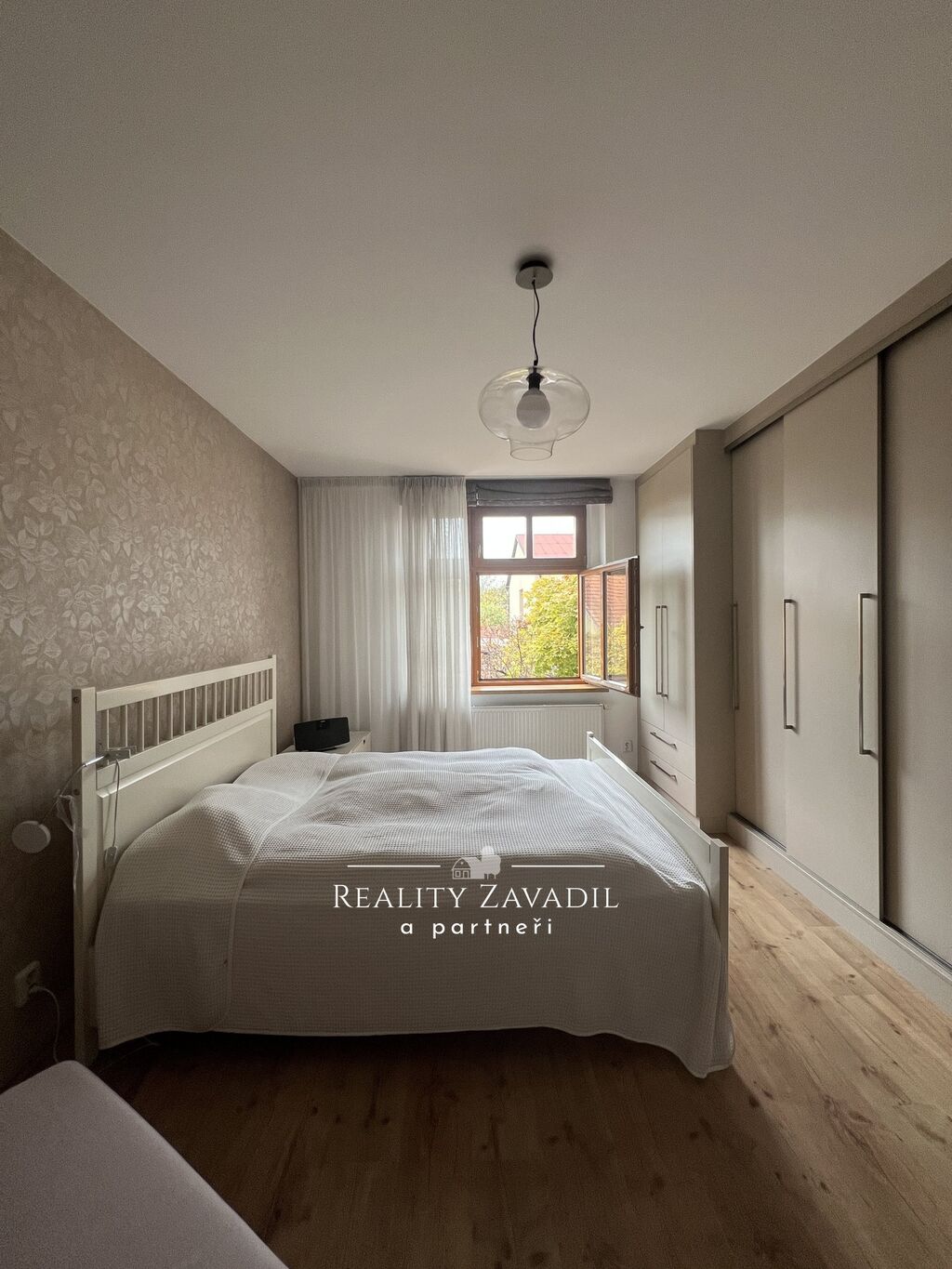 Z obývacího pokoje, kde se nachází rohová sedací souprava a pracovní kout se stolem, se vstupuje do ložnice s manželskou postelí a vestavěnými skříněmi, které zajišťují dostatek úložného prostoru.