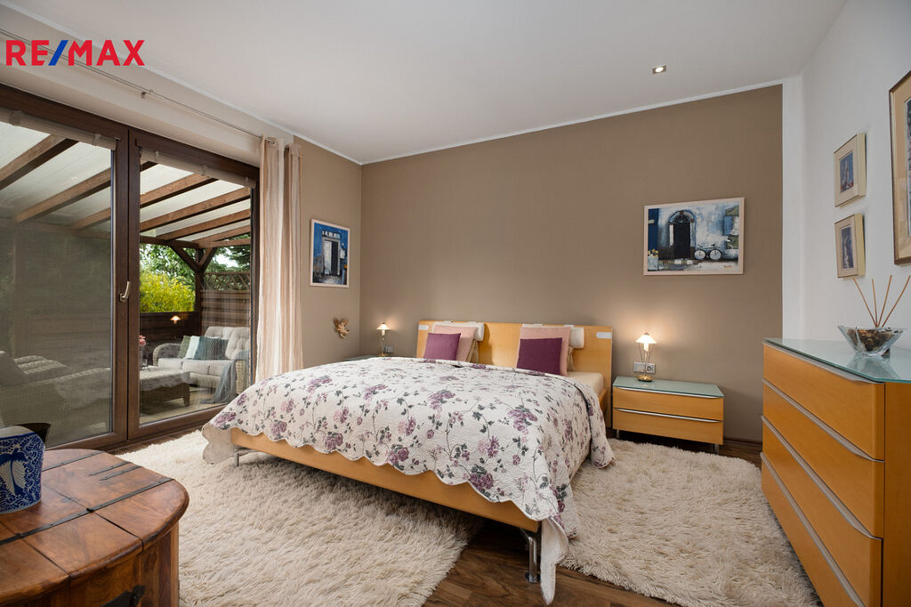 Terasa nabízí příjemné posezení s výhledem do zahrady, která je zajímavě členitá a díky vzrostlým stromům poskytuje naprosté soukromí.