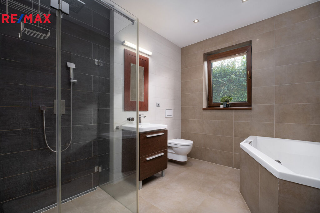Dům nabízí dvě koupelny (v obou vana, sprchový kout a WC) a dvě šatny.