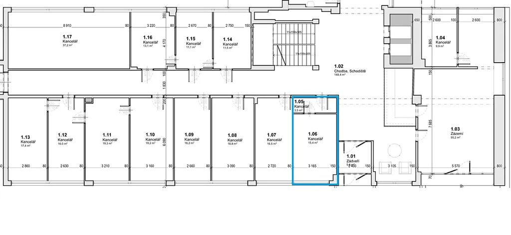 V případě zájmu je možné pronajmout i další kanceláře ve stejném patře o velikostech 16–20 m², případně celý soubor až 5 kanceláří.