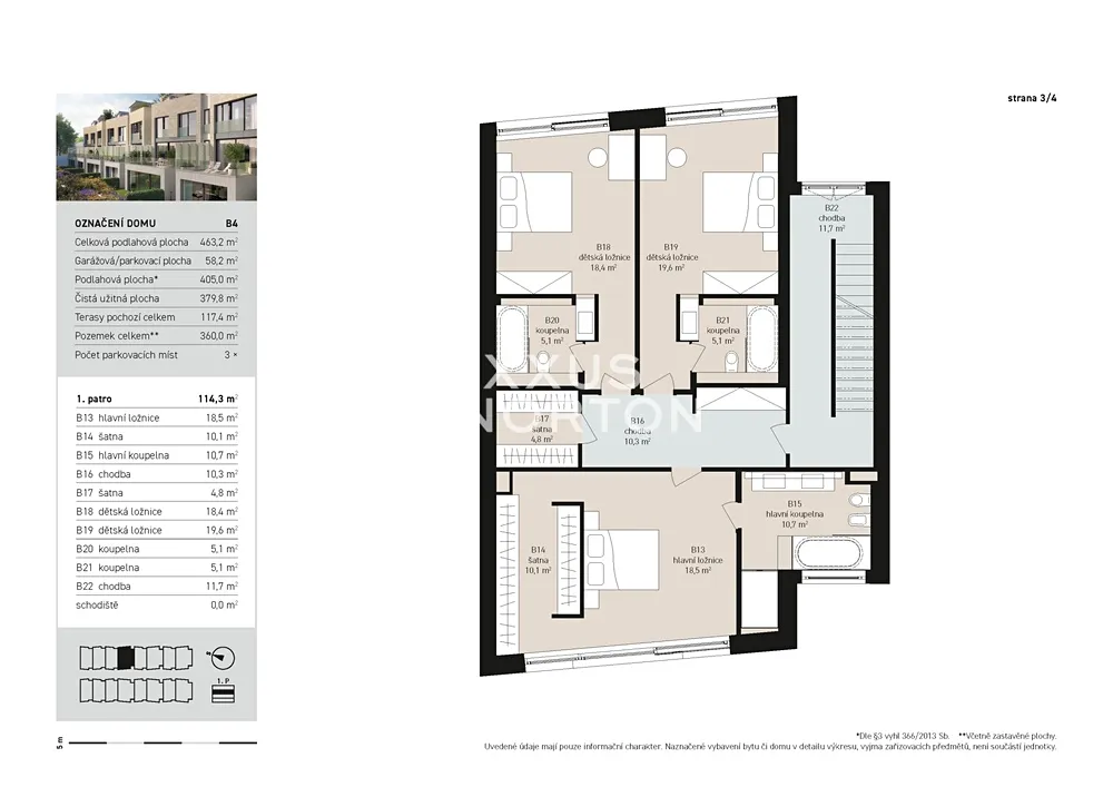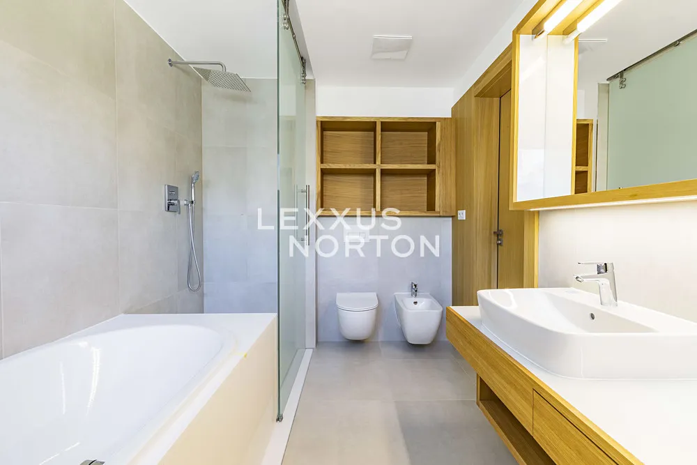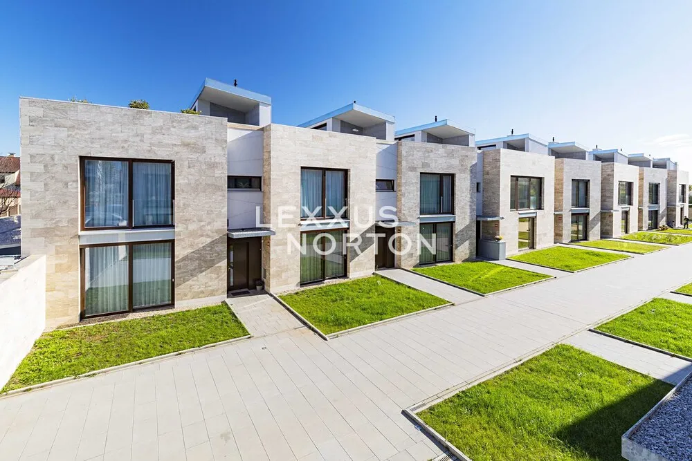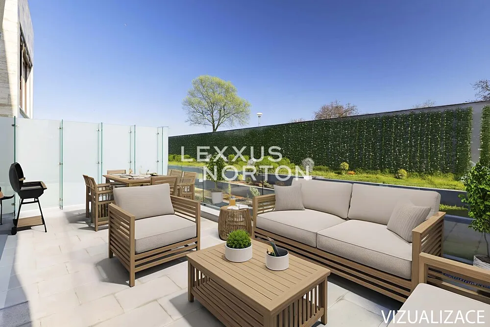 K prodeji nabízíme výjimečnou rodinnou řadovou vilu 6+kk s celkovou podlahovou plochou 405 m² a třemi parkovacími stáními v podzemních garážích. Tento promyšleně navržený dům je ideální pro rodiny hledající maximální komfort a flexibilitu prostoru. Přízemí domu nabízí velkorysý obývací prostor s přípravou pro kuchyňský kout (70,6 m²) s přímým výstupem na terasu s výhledem do kaskádovité zahrady. V přízemí je dále k dispozici pokoj pro hosty s vlastní koupelnou, který může sloužit také jako pracovna a další samostatná koupelna s toaletou. První patro disponuje hlavní ložnicí 18,5 m² s vlastní koupelnou a prostornou šatnou, 2 prostornými ložnicemi (18,4 m² a 19,6 m²) s vlastními koupelnami a další samostatnou šatnou. Korunou domu je krásná střešní terasa 84 m² s výhledy do okolní zástavby a zeleně, kterou lze při zastřešení využívat téměř celoročně.