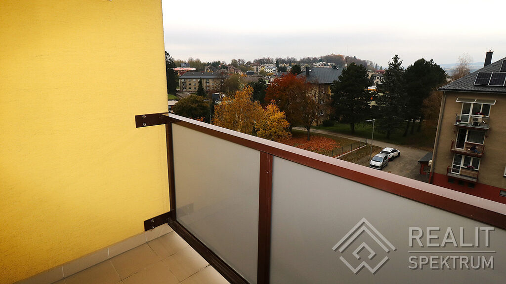 • Relaxace: Prosklená lodžie (balkon) s příjemným výhledem na město a parkoviště.