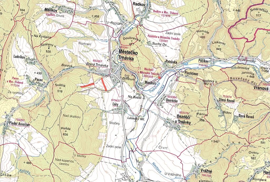 - parc. č. 129 v k. ú. Petruvka u Městečka Trnávky je zapsán na LV 50 a je prodáván v podílu 1/2. Celková výměra parcely je 3 181 m², k prodeji tedy připadá 1 590 m².