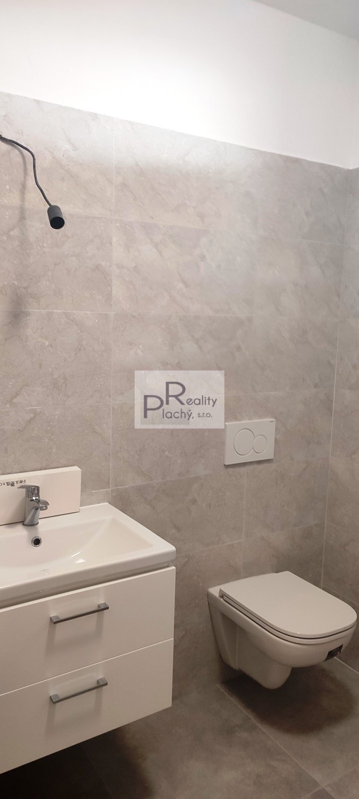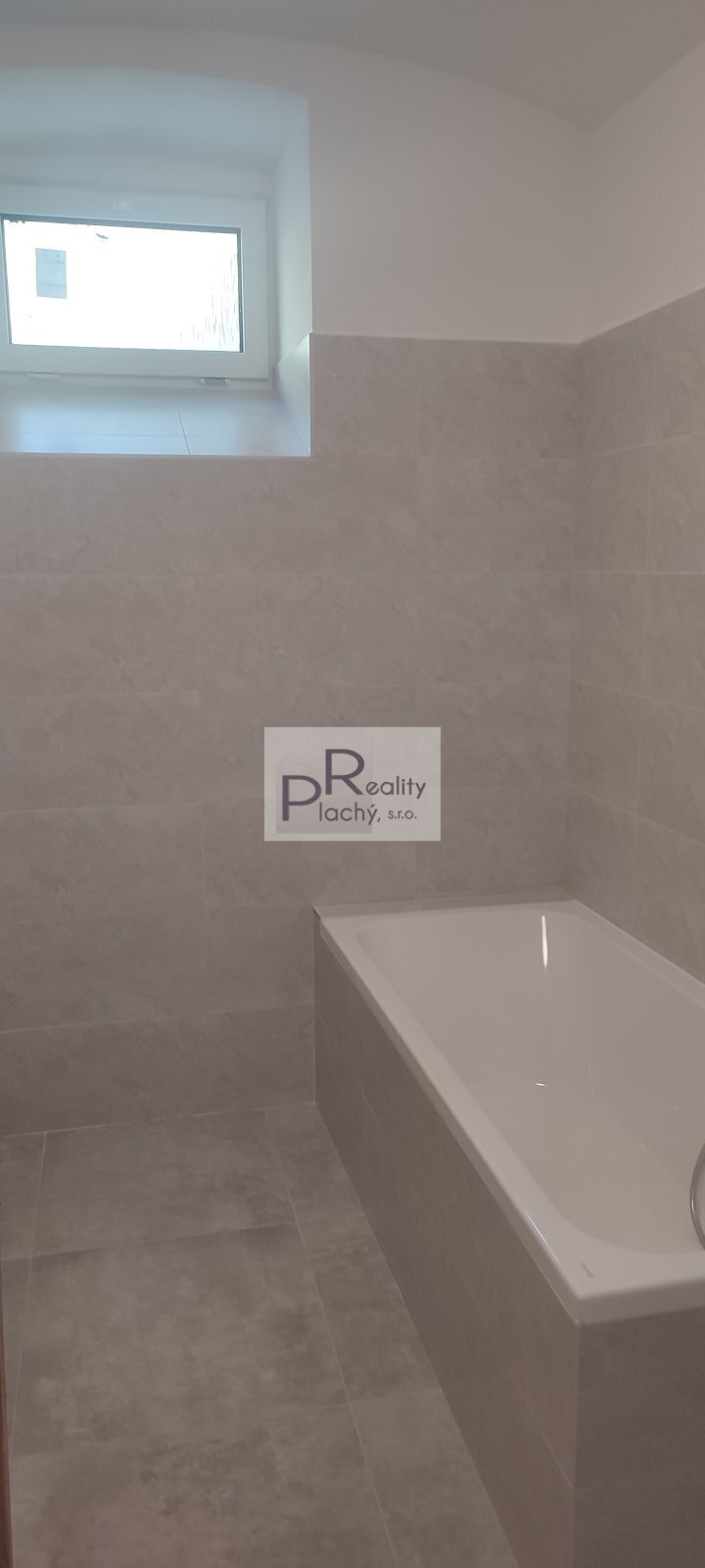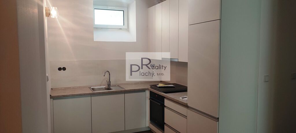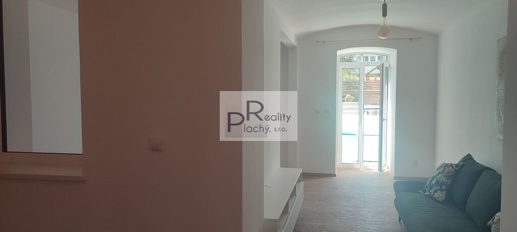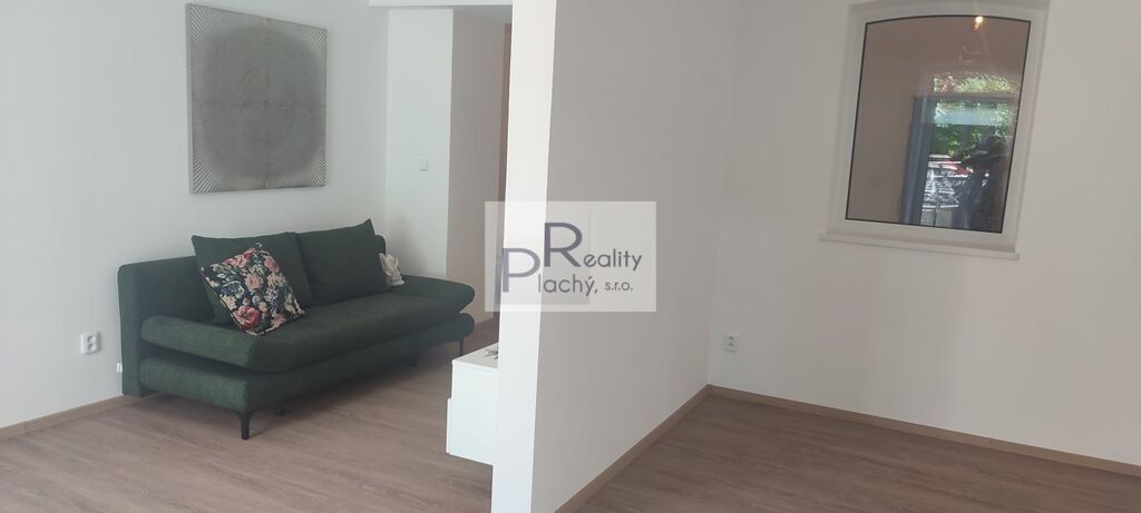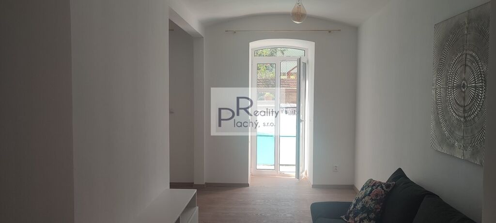 Byt ve sníženém přízemí menšího bytového domu je architektonicky velmi zajímavě vyřešený. Celý je koncipován jako moderní, otevřený prostor. Předsíň volně přechází do kuchyně, která je otevřená do bývacího pokoje. Ložnice je částečně oddělena od obývacího pokoje zdí. Z pokoje i ložnice vedou prosklené dveře na malou soukromou terasu. Byt je částečně zařízený. Vytápění je podlahové elektrickým kotlem, ohřev vody el. bojlerem. Nájemné je 12.000,- Kč měsíčně + 500,- Kč záloha na vodné. Elektřina bude přepsána na nájemníky. Vratná kauce 20.000,- Kč. V domě jsou společné prostory pro uskladnění kol, nebo kočárků a sušárna. Volný od 01.11.2023