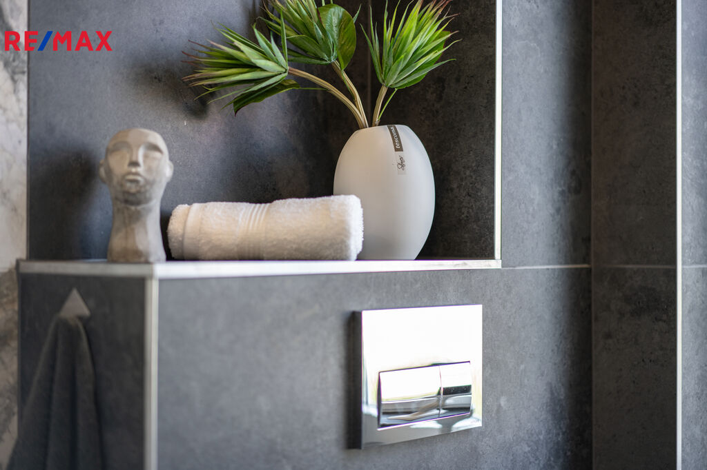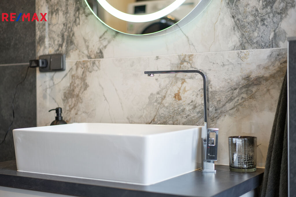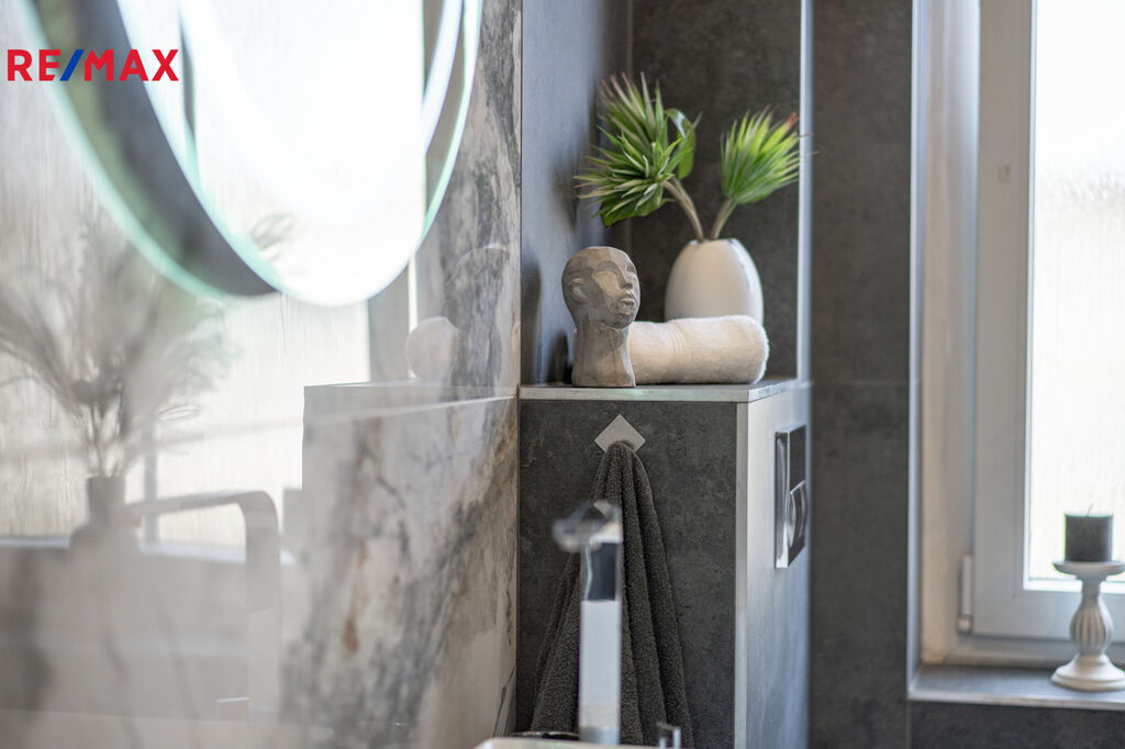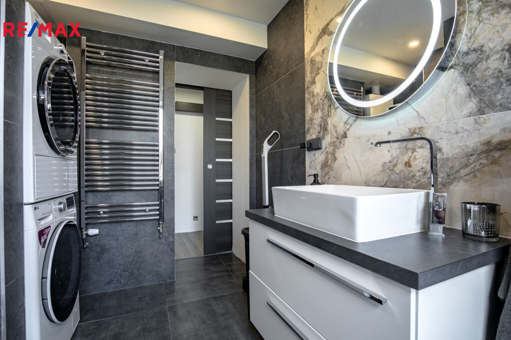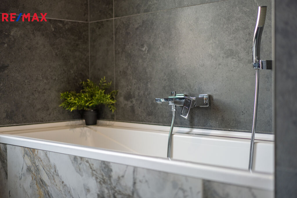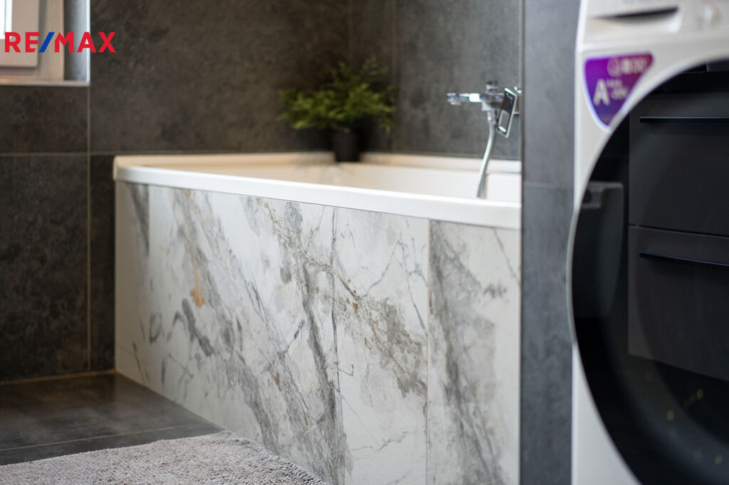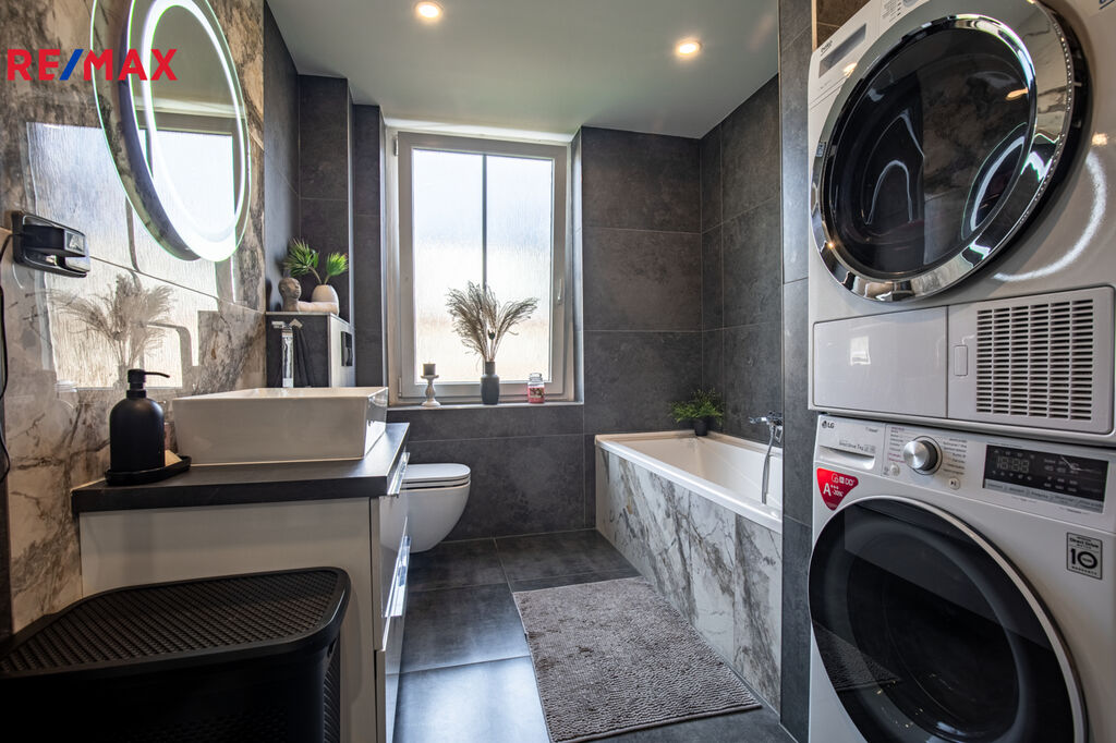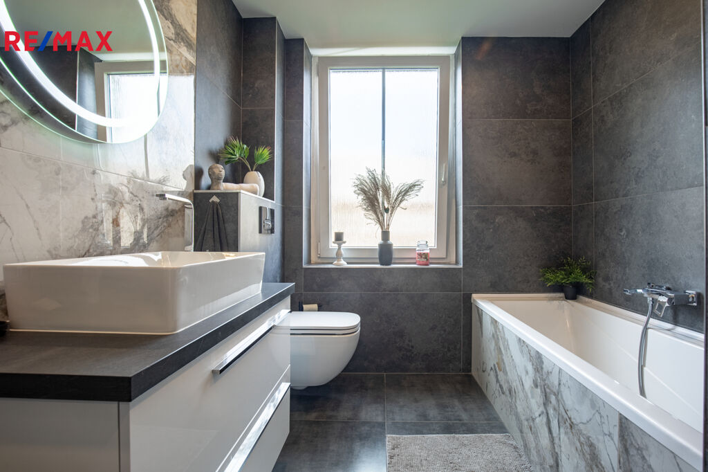 ✅ Koupelna s oknem do zeleně, obložená v kombinaci antracit + světlý mramor, je vybavena vanou, závěsným WC, pračka + sušička + kotel – vše v ceně.