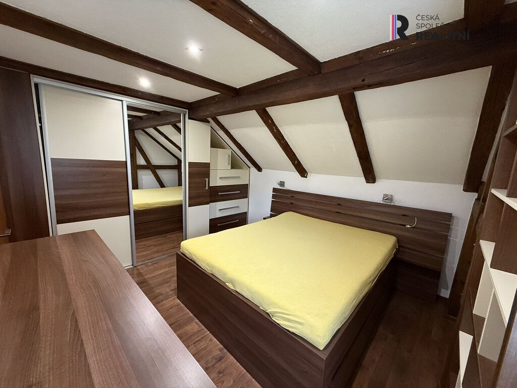V patře je předsíň s psacím stolem a šatnou, dvě ložnice – jedna z nich má vlastní toaletu a vstup na terasu s příjemným výhledem. Druhá ložnice je vybavena vestavěným nábytkem na míru od truhláře.