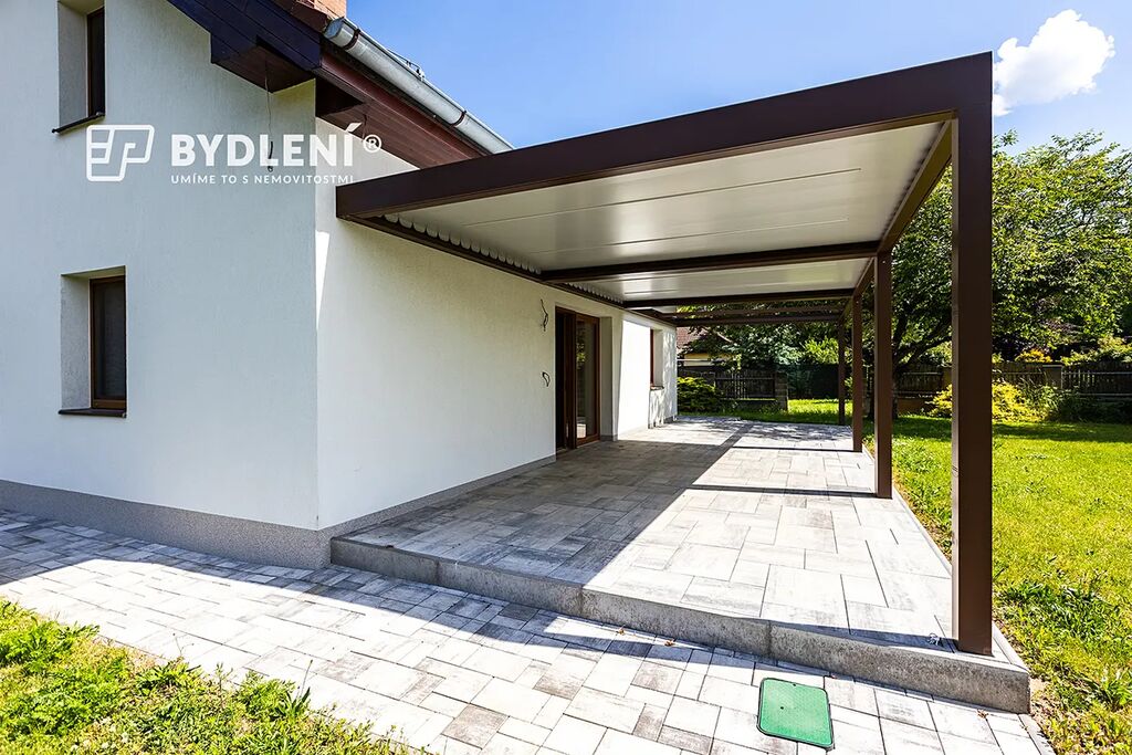 • Zastřešenou terasu u domu přístupnou přímo z obývacího pokoje, elektricky dálkově ovládaná natáčecí lamelová střecha terasy