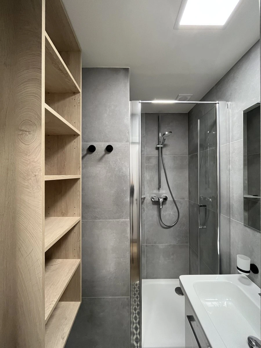 Při vstupu do bytu uvidíte prostornou chodbu s úložným prostorem a vstupy do jednotlivých místností. Dispozice nabízí koupelnu s umyvadlem, sprchovým koutem, úložnými prostory. Toaleta se nachází zvlášť.