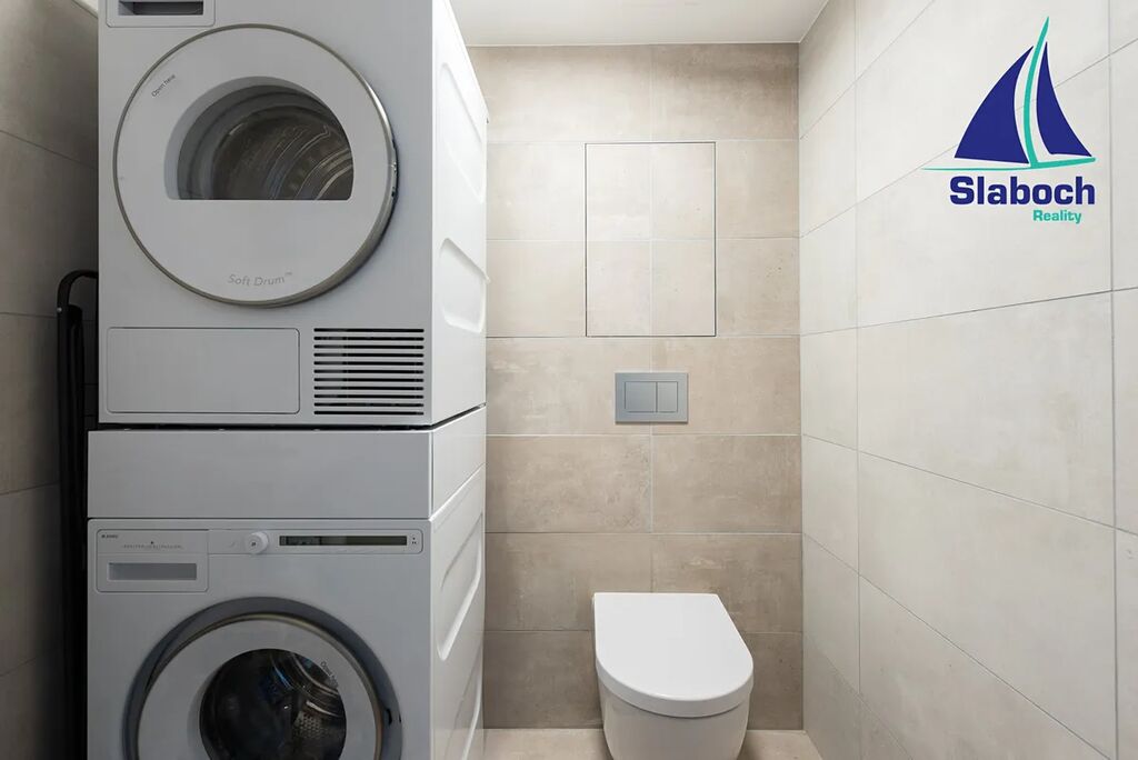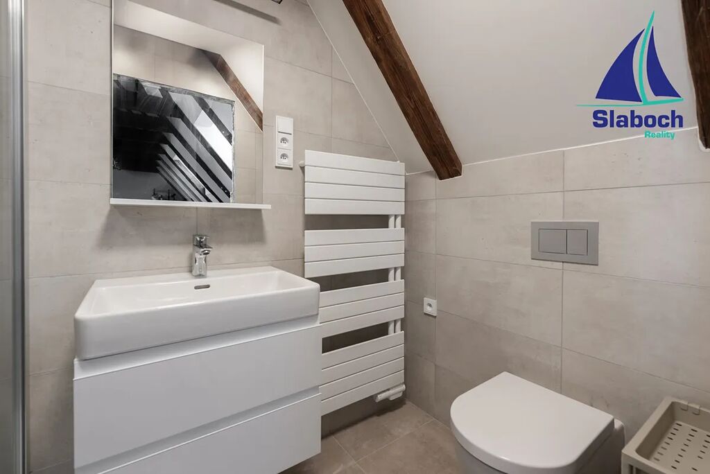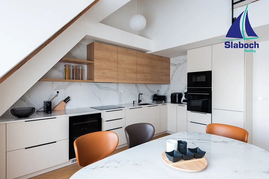 Ve spodním patře dominuje prostorný obývací pokoj s kuchyňským koutem včetně zcela nové moderní kuchyňské linky se spotřebiči, ložnice s úložným prostorem, koupelna s vanou, předsíň včetně skříní na míru, šatna (komora) a samostatná toaleta s místem na pračku a sušičku, v horním patře další pokoj s druhou koupelnou se sprchovým koutem a druhou toaletou. Na podlahách kvalitní dřevěné podlahy a dlažba, v bytě jsou použity kvalitní přírodní materiály.