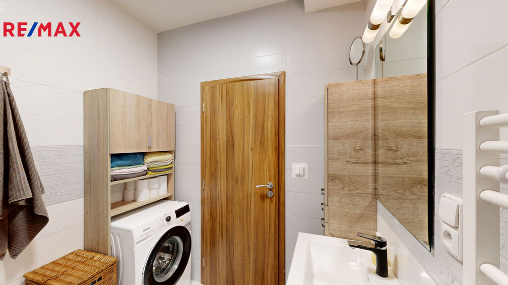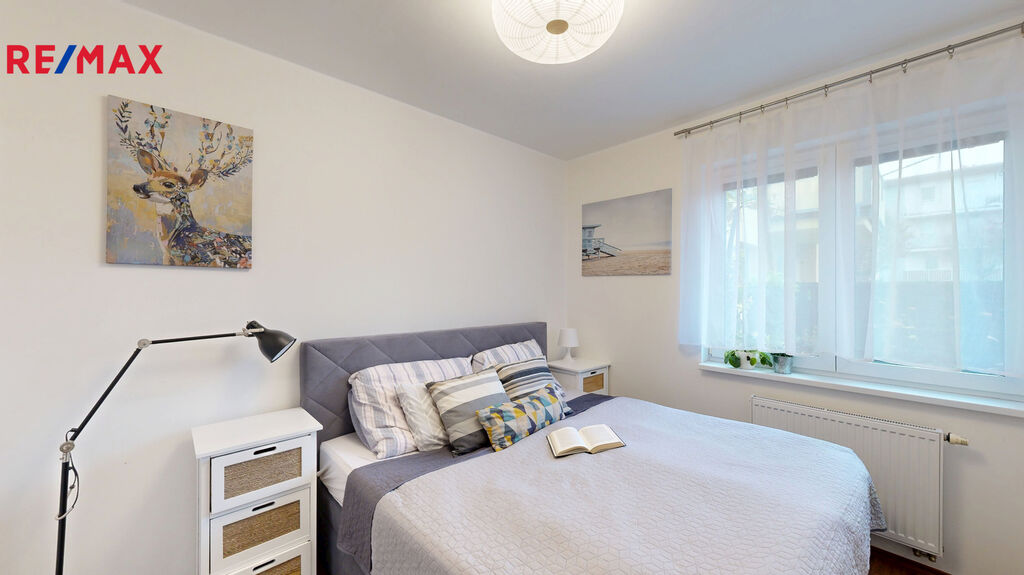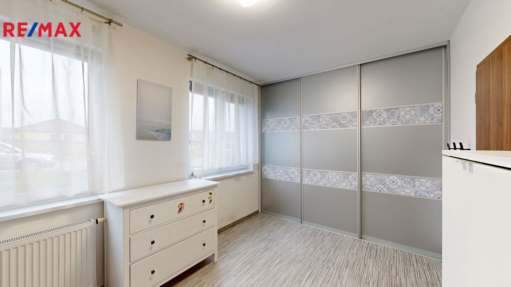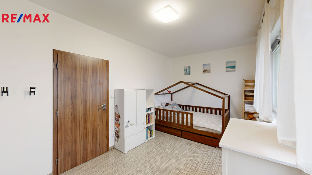 Předsíň 6 m2, koupelna se sprchovacím koutem a WC 5 m2, dětský pokoj ( s vestavěnou skříní ) 15 m2, obývací pokoj 18 m2, s kompletně vybavenou kuchyňskou linkou a vstupem na terasu ( dá se z ní dále pokračovat přímo do parčíku za domem) o výměře 28 m2, ložnice 9 m2. Oba pokoje mají JZ orientaci. K bytu dále náleží komora o výměře 6 m2, která se nachází hned vedle bytové jednotky.