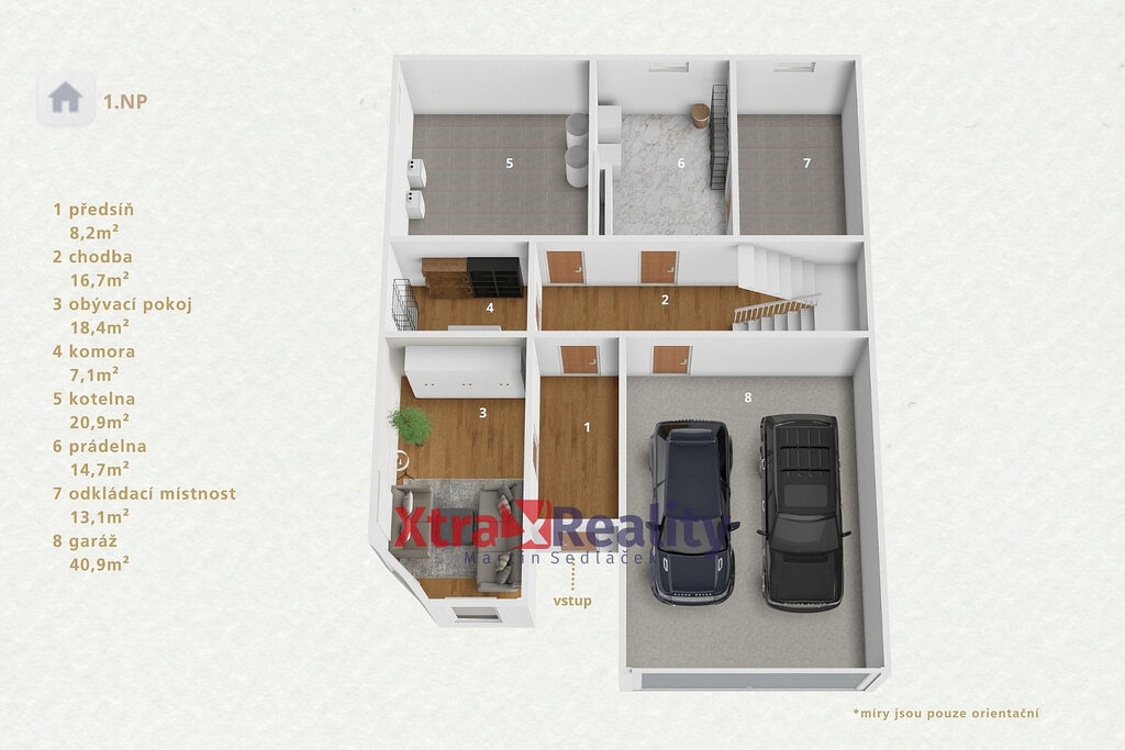 Dálkovým ovládáním otevřete garáž. Jelikož má velkorysou rozlohu přes 40m², můžete zde zaparkovat 2 vozidla. Bez ohledu na případné nepříznivé počasí pohodlně vyložíte nákup a projdete rovnou do domu.