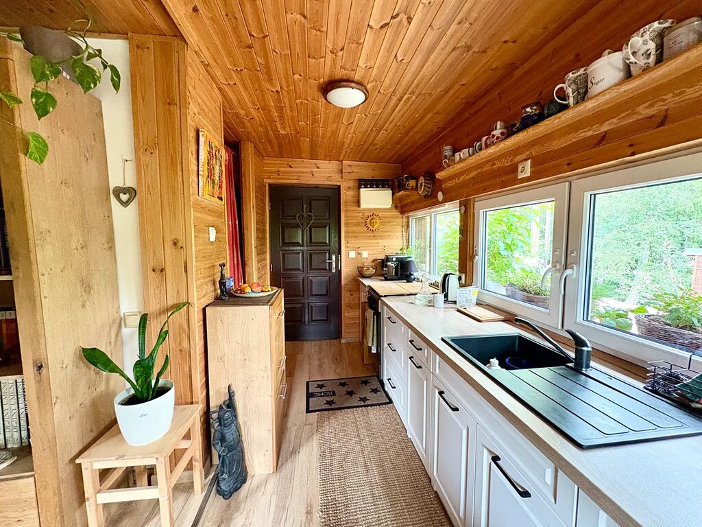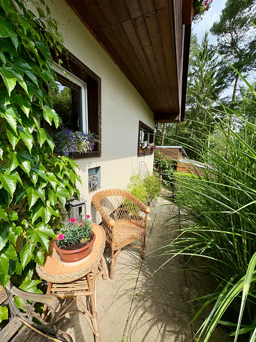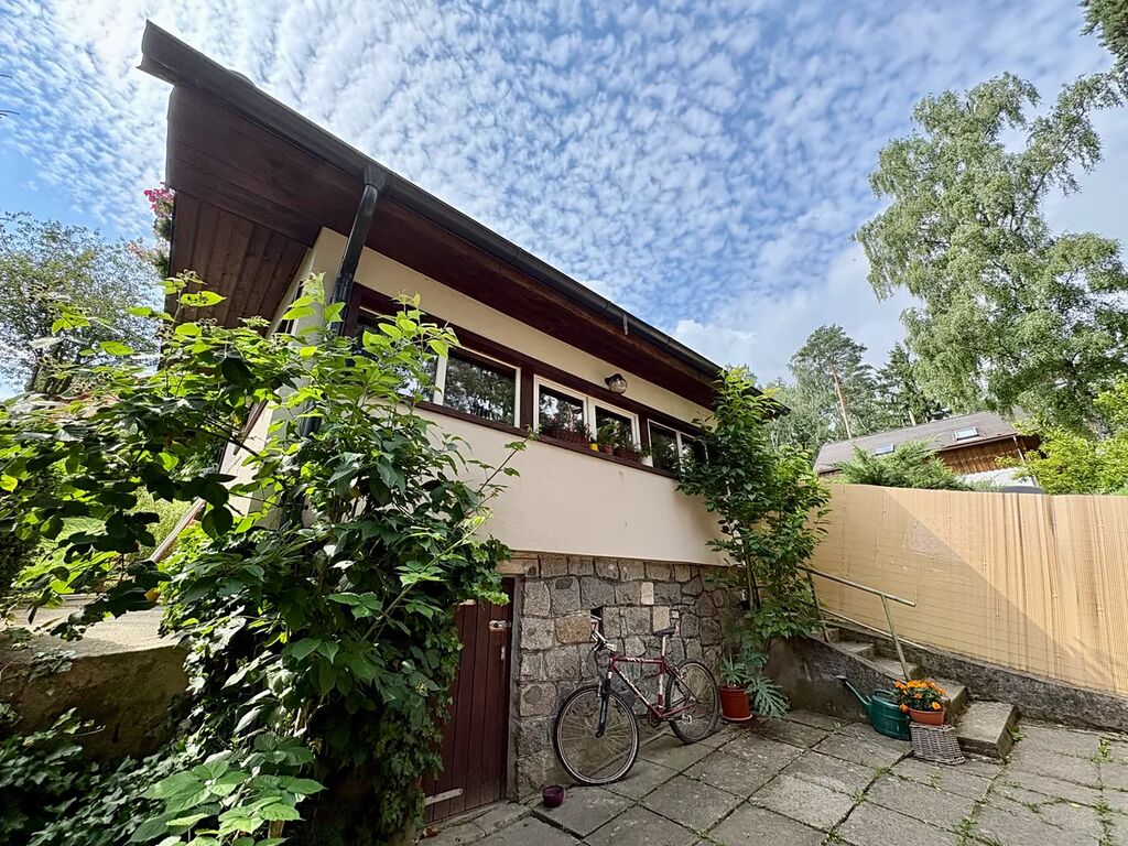 Udržovaná terasovitá zahrada, která chatu obklopuje poskytuje dostatečné soukromí a má řadu romantických zákoutí k posezení, lenošení nebo kochání se rozkvetlými záhony. Najdete zde jak okrasné tak užitkové rostliny a vzrostlé stromy a je zde i oddělený výběh pro slepice s kurníkem. Je zde také studna a nádrž na dešťovou vodu využívaná k zalévání zahrady. Součástí dvora je dřevěná kůlna s koupelnou, která může sloužit jako ateliér nebo dílna. Chata je vzhledem k velikosti vhodná pro 1-2 obyvatele. Nahlášení trvalého bydliště je zde možné, stejně jako financování hypotékou.