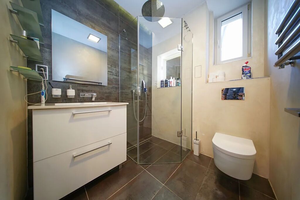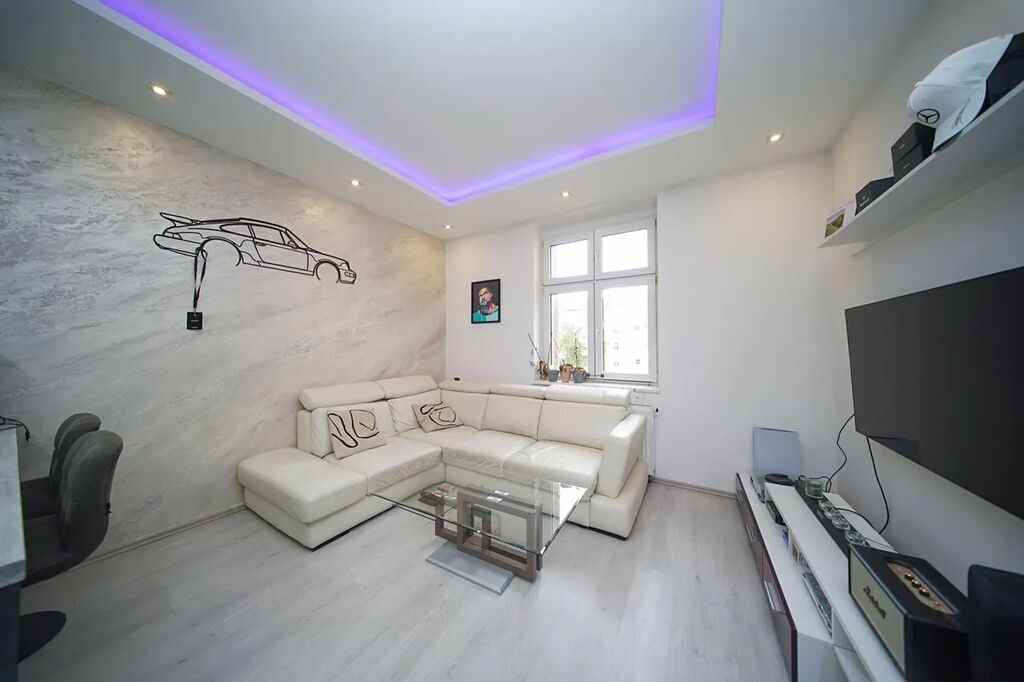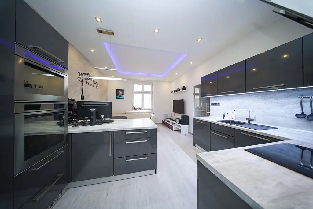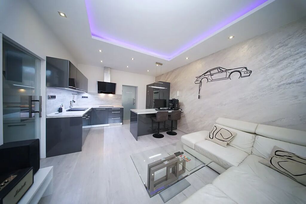 Vysoké stropy (284 cm) se sádrokartonovými podhledy s bodovým osvětlením a s dálkově ovládaným barevným led podsvícením.