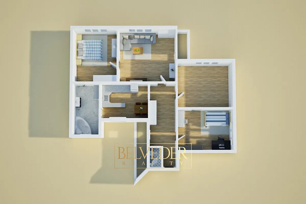 Kuchyně současně slouží jako jídelna . Obývací pokoj je vzdušný a vhodný pro odpočinek i setkávání. Ložnice nabízí klidovou zónu s dostatkem místa pro úložné řešení. Pracovna je ideální pro home office či koníčky. Další pokoj může fungovat jako druhá ložnice nebo dětský pokoj. Koupelna je prostorná, s rohovou vanou.
