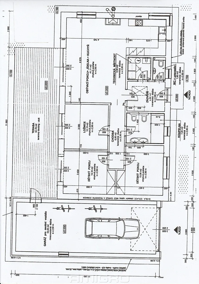 Dispozice domu je 4+kk s garáží pro 2 automobily a plánovanou terasou s výměrou 43 m2.