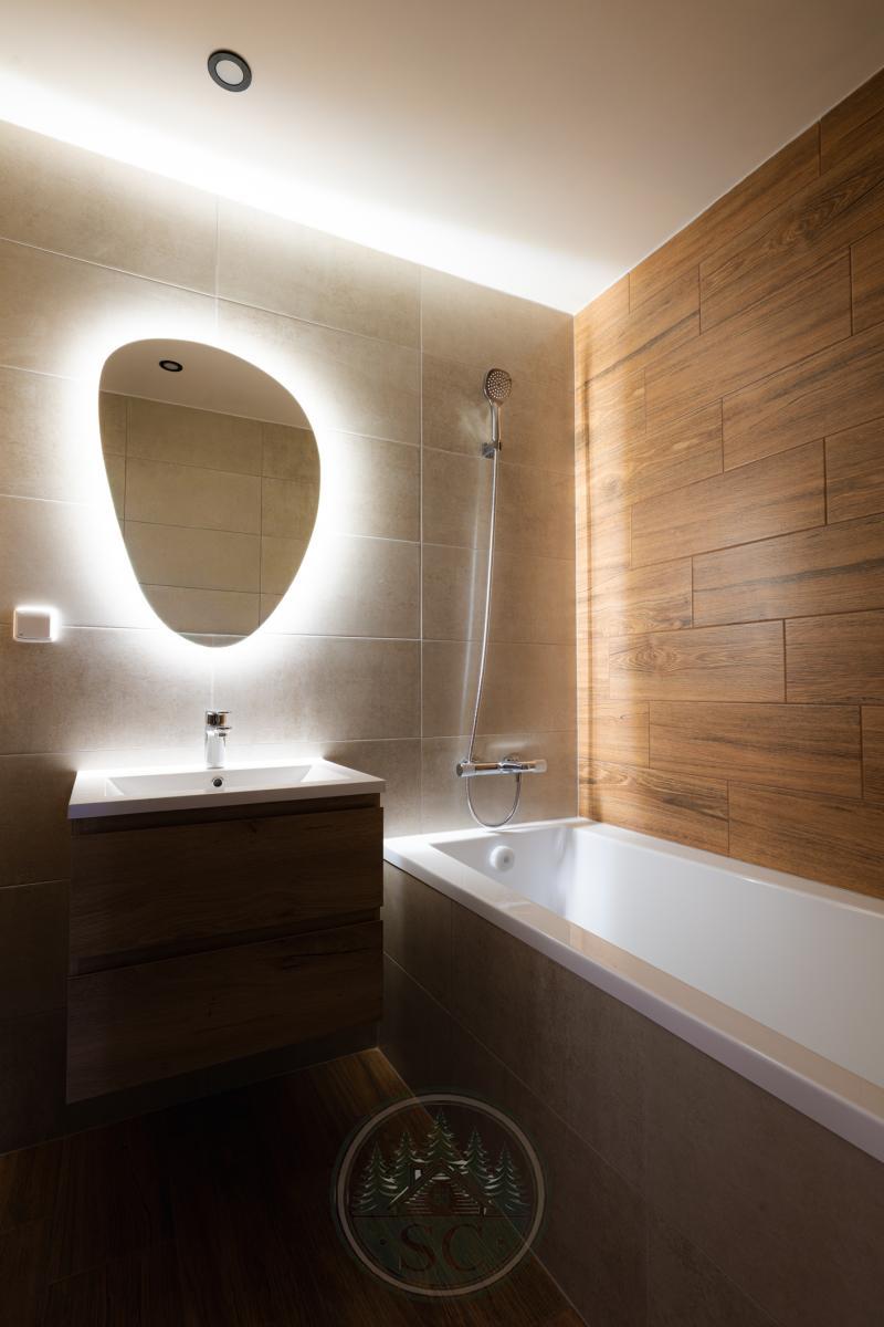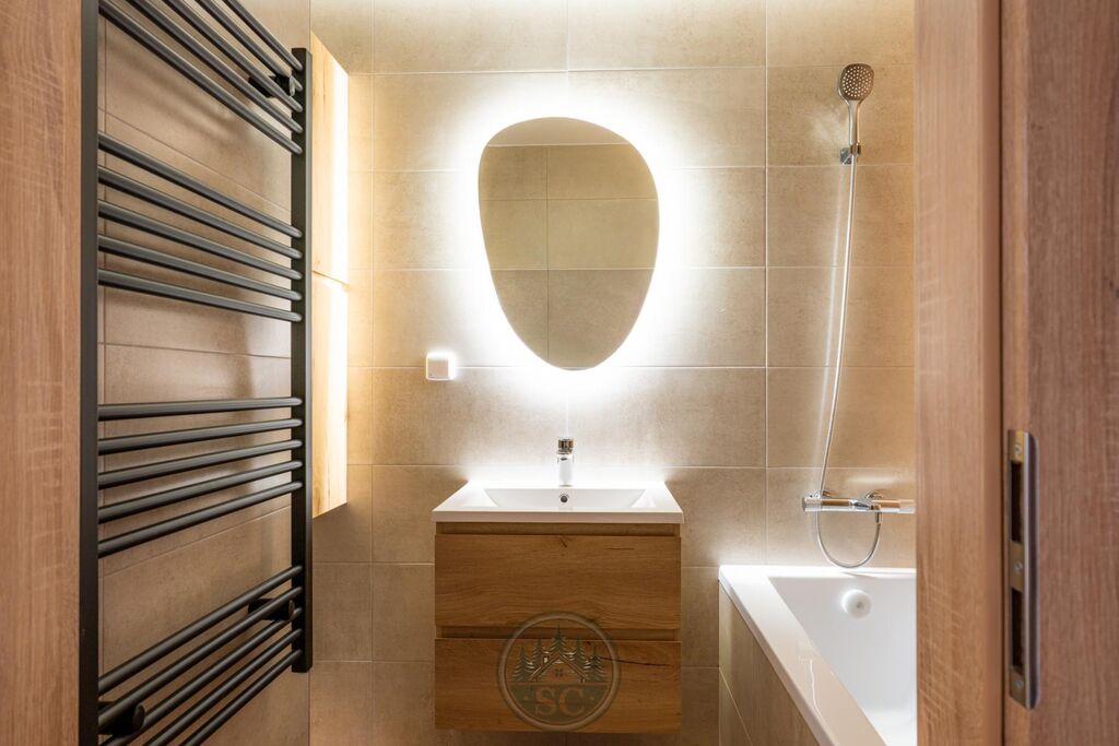 Koupelna působí velmi elegantně, je vybavená umyvadlem se skříňkou a úzkou skříní, které spolu perfektně ladí. Nechybí topný žebřík, vana a svítící zrcadlo.