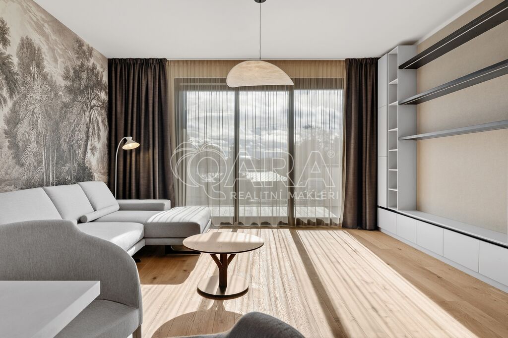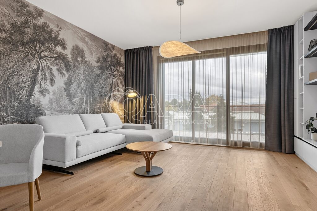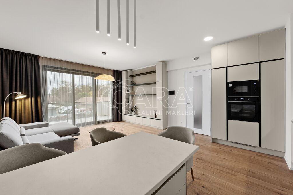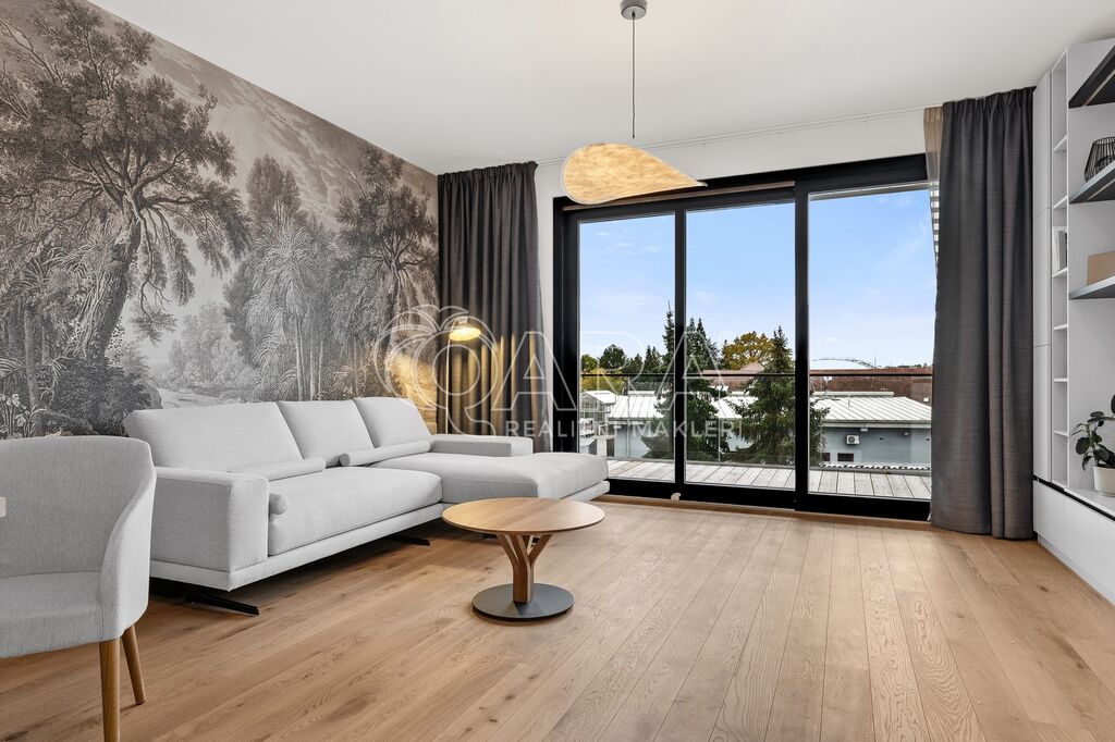 Interiér navržený designérkou na míru vyniká promyšleným uspořádáním, nadčasovým stylem a vysokou kvalitou zpracování. Dominantou bytu je prostorný obývací pokoj s kuchyní, jídelním koutem a přímým vstupem na balkon s výhledem do zeleně. Kuchyňský kout je zařízen veškerými spotřebiči značky AEG (myčka na nádobí, lednice, mrazák, trouba, indukce, digestoř, mikrovlnná trouba). Interiér je vybaven nábytkem z dílny Hanák, vyrobeným v nejvyšším standardu kvality. Precizní zpracování, prvotřídní materiály a elegantní design podtrhují exkluzivní charakter prostoru.