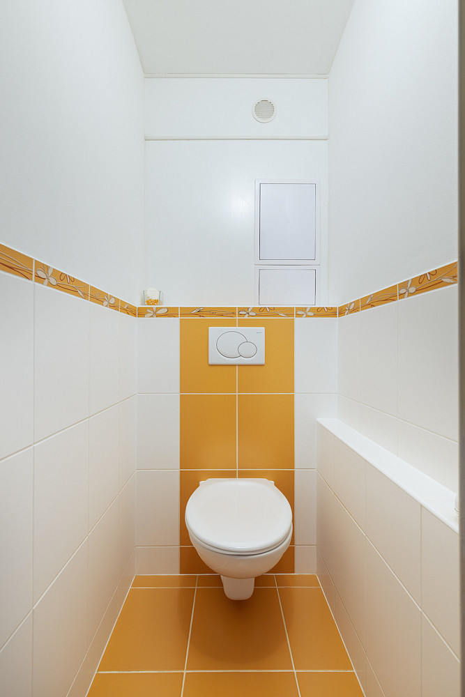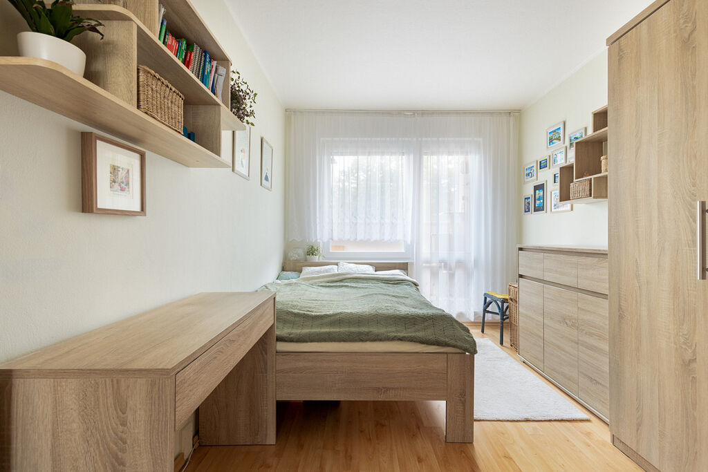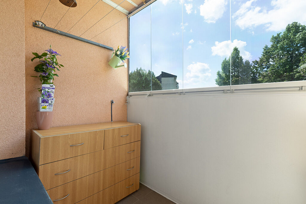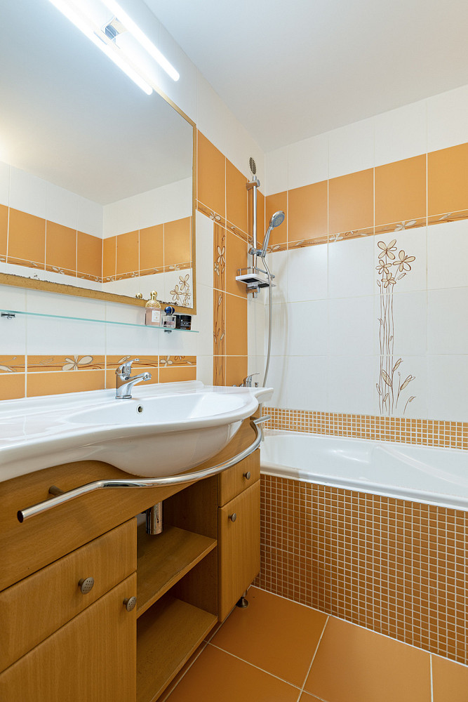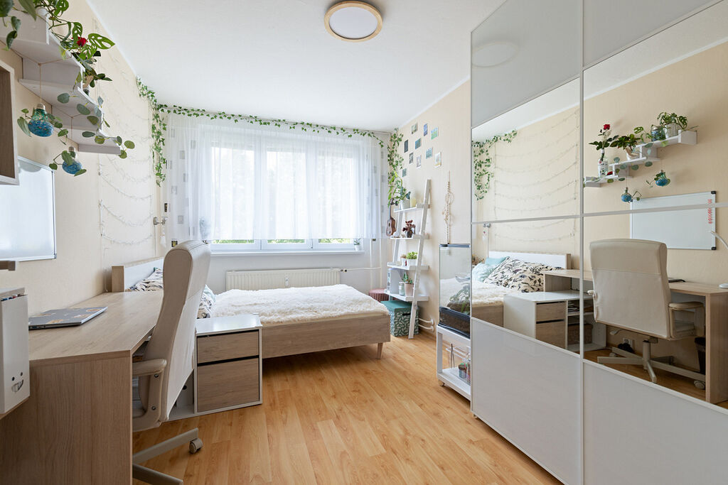 Dispozičně je byt velmi prakticky řešen – najdete zde prostornou vstupní chodbu s úložnými prostory a technickým kumbálem (s pračkou a sušičkou), kuchyň vybavenou myčkou, troubou se sporákem a digestoří. Dále na chodbu navazuje koupelna, samostatné WC, pracovna a dětský pokoj. Hlavní část bytu tvoří světlý obývací prostor propojený s ložnicí a vstupem na prosklenou lodžii. Díky orientaci oken působí celý byt velmi vzdušně, prosvětleně a příjemně.