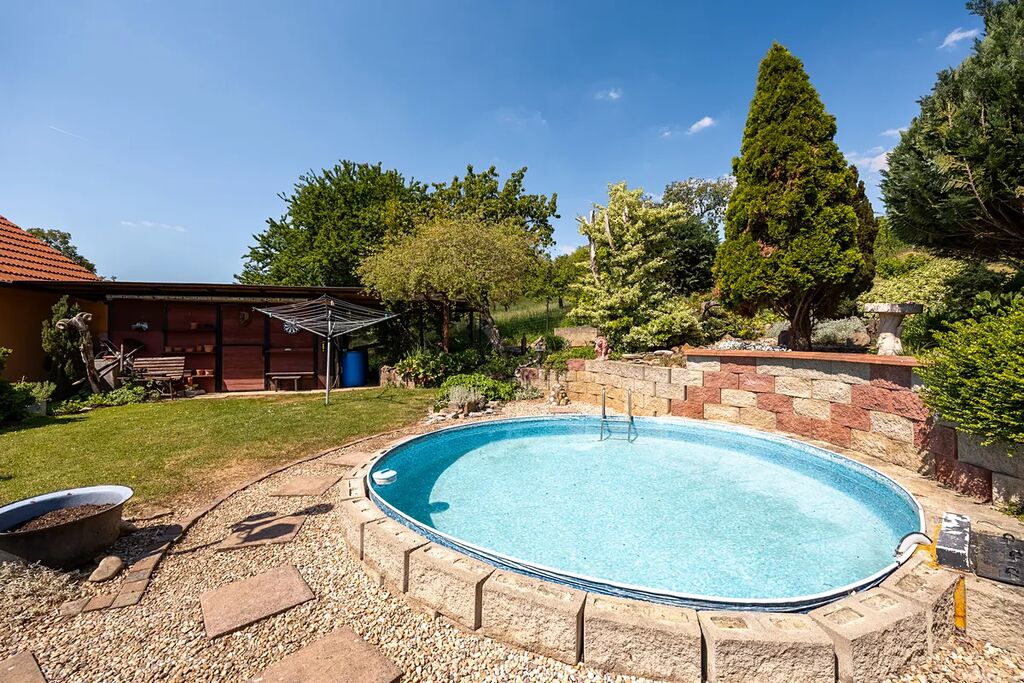 Krásná upravená zahrada v mírném svahu s bazénem a jezírkem.
