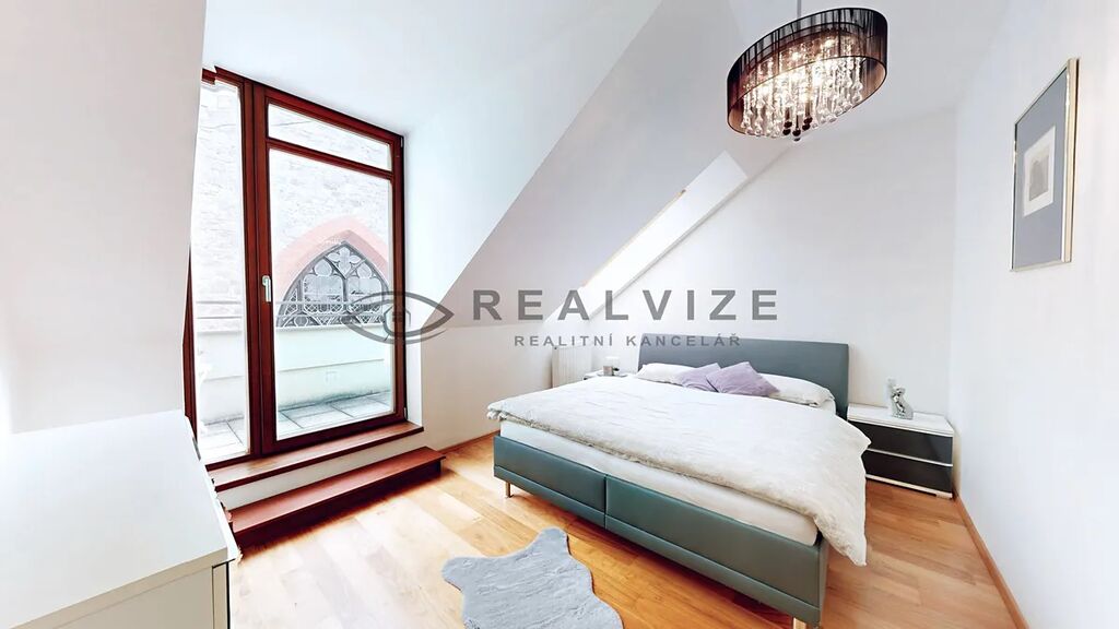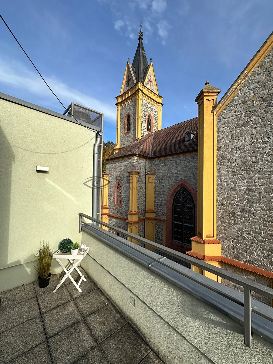 Prostorná terasa s výhledem na sousedící kostel, poskytuje velmi příjemné relaxační místo.