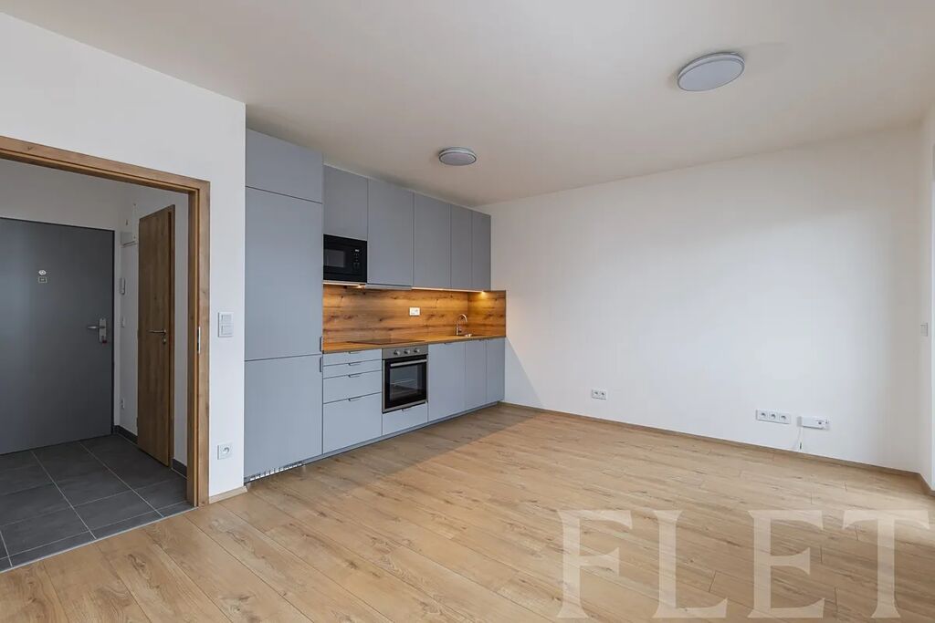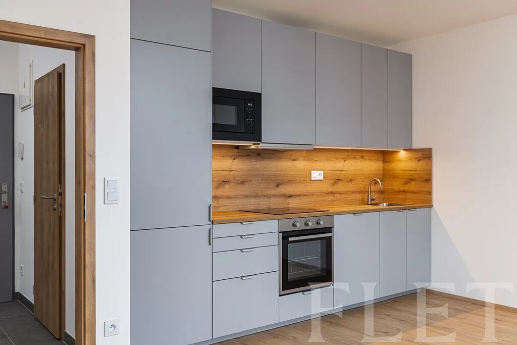 Interiér bytu zaujme stylovou kuchyní v kombinaci dřeva a neutrálních barev, která působí elegantně a přirozeně. Kuchyň je plně vybavena včetně vestavěné myčky a poskytuje dostatek úložného i pracovního prostoru. Obytná část je díky velkým oknům příjemně prosvětlená a plynule navazuje na prostorný balkon s výhledem do krásné nové zástavby. Koupelna je moderně řešená – nechybí sprchový kout, toaleta ani kvalitní sanitární vybavení.