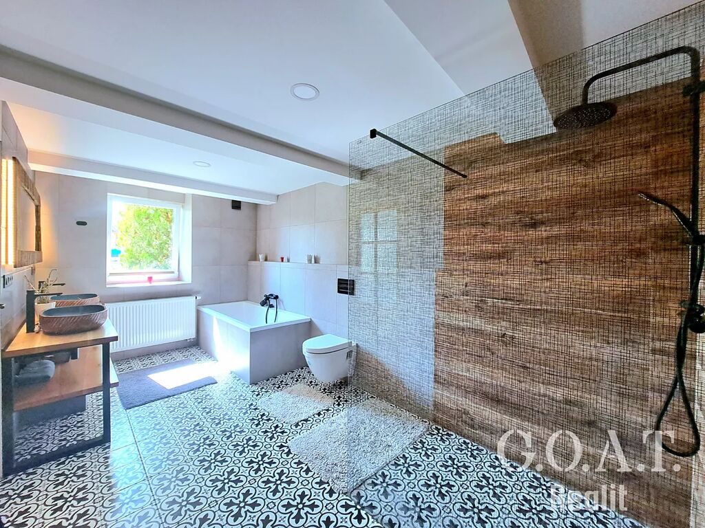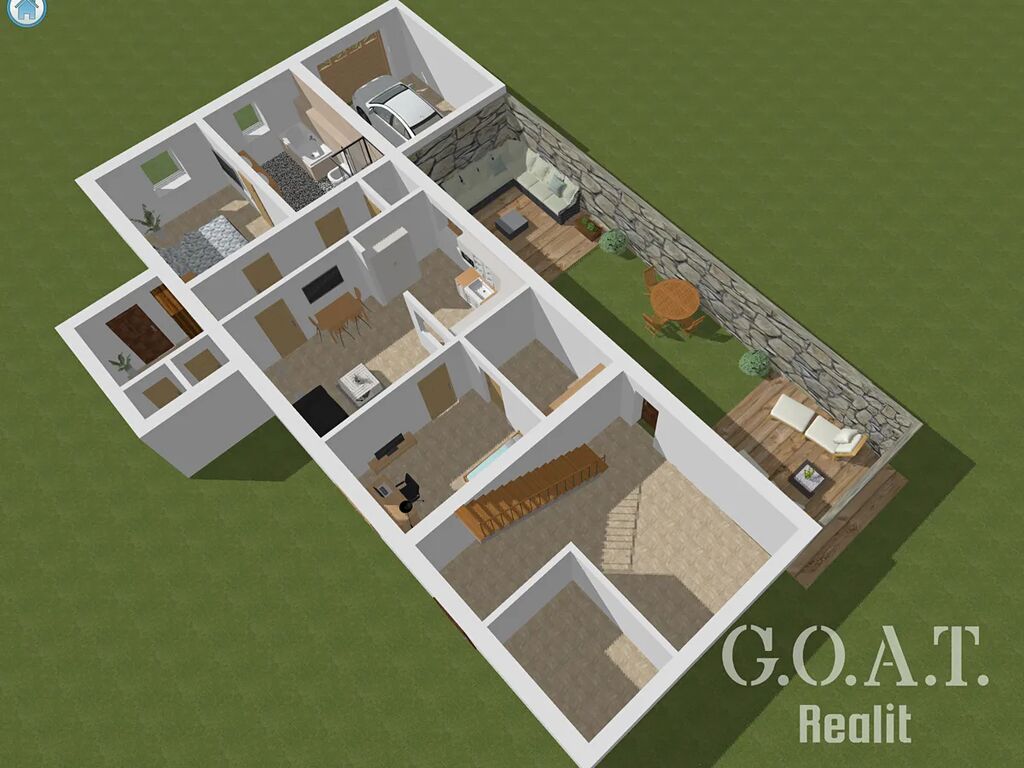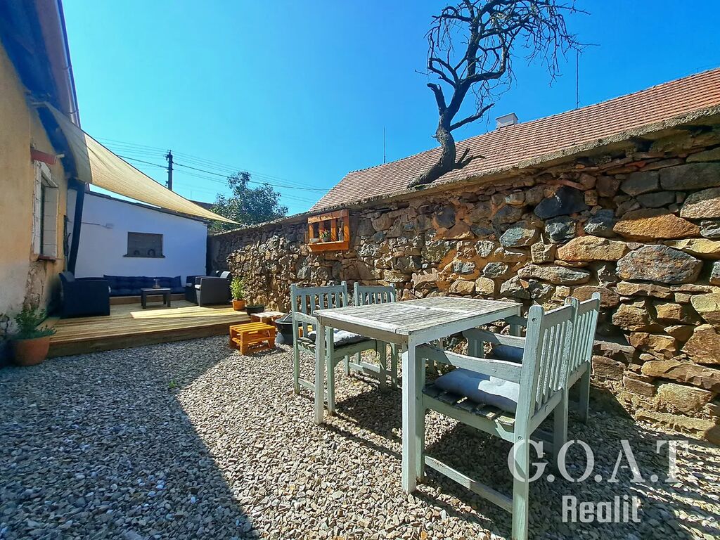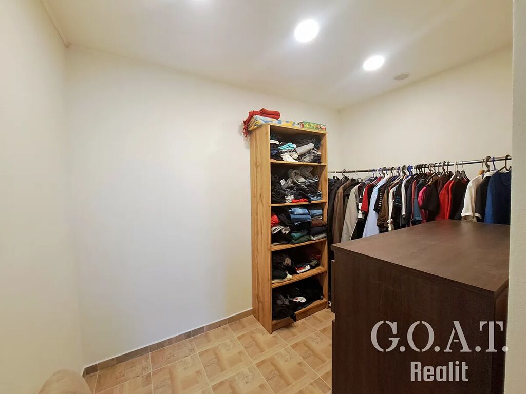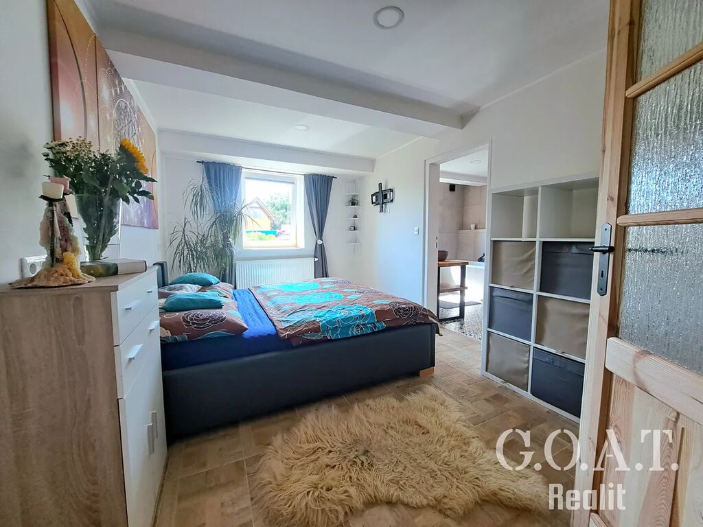 Uvnitř najdete prostornou vstupní halu, praktickou šatnu, komoru a samostatné WC. Dominantou domu je světlý obývací pokoj s kuchyňským koutem a výhledem do udržované zahrady. Hlavní ložnice má vlastní koupelnu s vanou i sprchovým koutem, druhý pokoj s velkou šatnou se dá využít jako dětský pokoj, pracovna nebo pokoj pro hosty. Ze zahrady se vstupuje do samostatné části domu s dílnou, společenskou místností, sklepem a skladem nářadí. Nechybí ani garáž a dostatek úložných prostor.