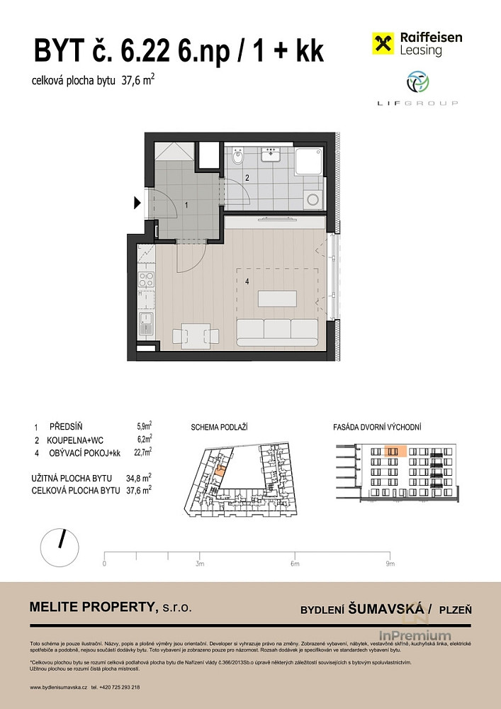 Nabízíme kompaktní byt 1+kk o celkové ploše 37,6 m² ve 6. nadzemním podlaží novostavby Bydlení Šumavská v širším centru Plzně. Dispozice bytu zahrnuje obývací pokoj s kuchyňským koutem (22,7 m²), předsíň (5,9 m²) a koupelnu s toaletou (6,2 m²). Okna jsou orientována na východní, dvorní stranu objektu, což zajišťuje klidné prostředí bez hluku z ulice. Součástí bytu je sklepní kóje, možnost dokoupení garážového stání. Projekt je aktuálně ve výstavbě, kolaudace je plánována na podzim 2027. Byt bude dokončen ve standardním provedení s možností klientských úprav dle pravidel projektu. Bydlení Šumavská nabízí kombinaci moderní architektury, úsporného provozu (energetická třída A) a skvělé dostupnosti – včetně MHD, obchodů, škol a parků v docházkové vzdálenosti. Ideální jako startovací byt nebo investiční příležitost.