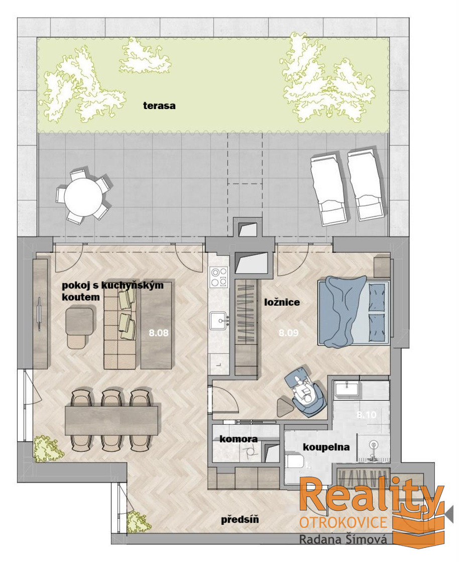 Dispozice: prostorná předsíň s vestavnými skříněmi a pracovním koutkem, prostorný obývací pokoj s kuchyňským koutem, ložnice, oba pokoje mají vstup na terasu, komora, kde umístíte i pračku se sušičkou, koupelna se sprchovým koutem, umývadlem a WC. Okna plastová s trojskly a venkovními žaluziemi, ÚT podlahové, podlahy kryje vinyl a dlažba, vnitřní dveře s obložkami, vstupní dveře bezpečnostní.
