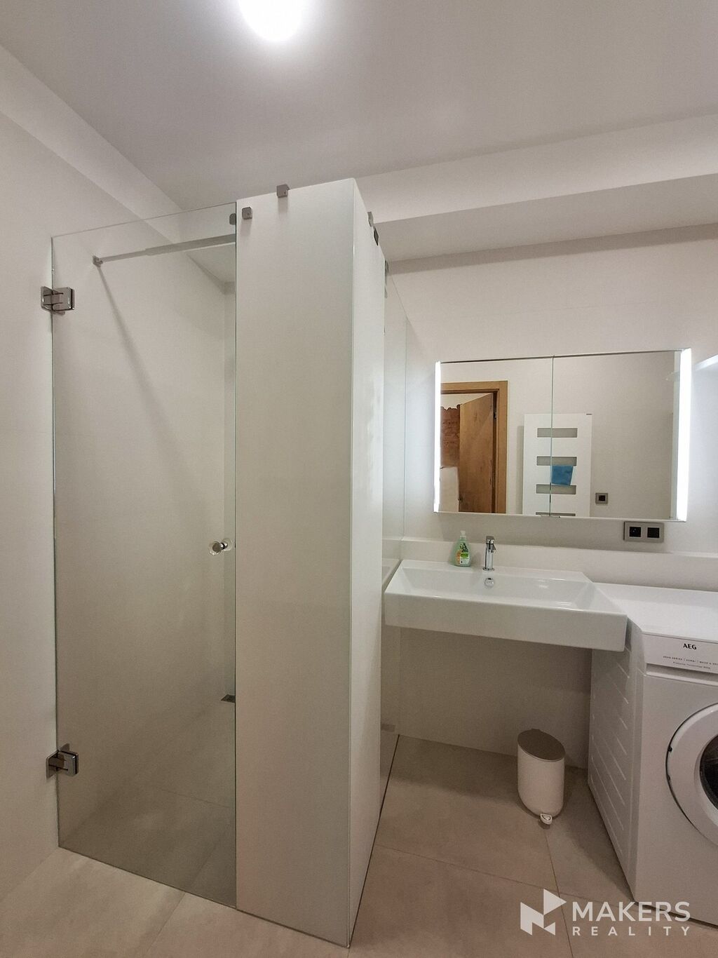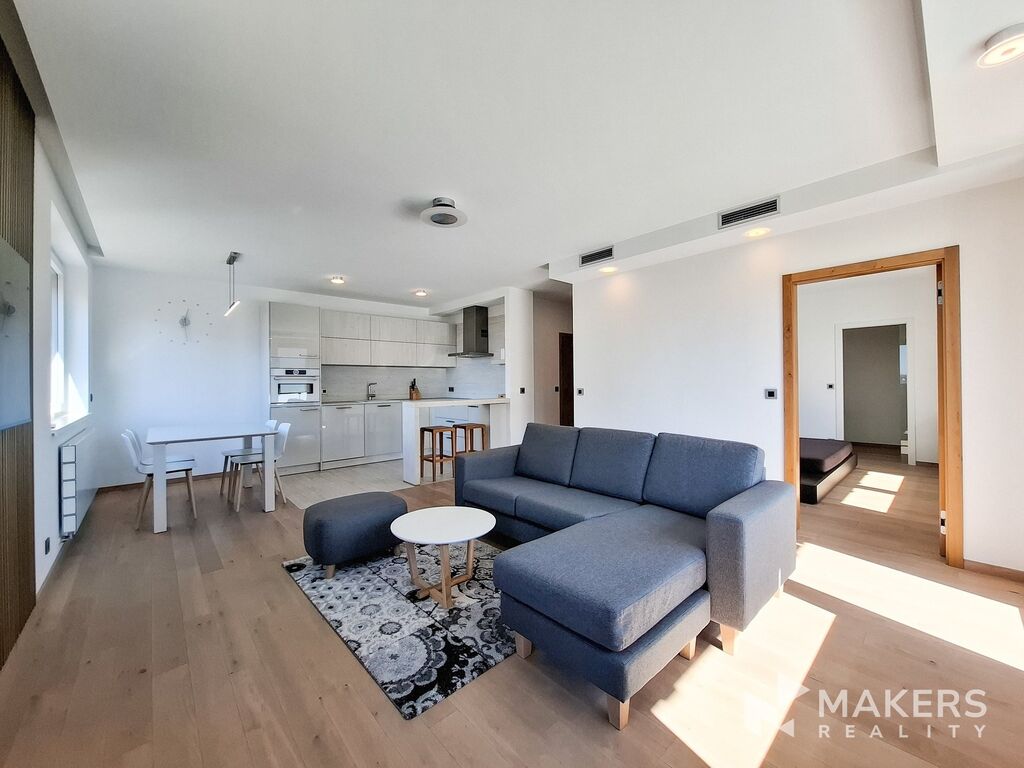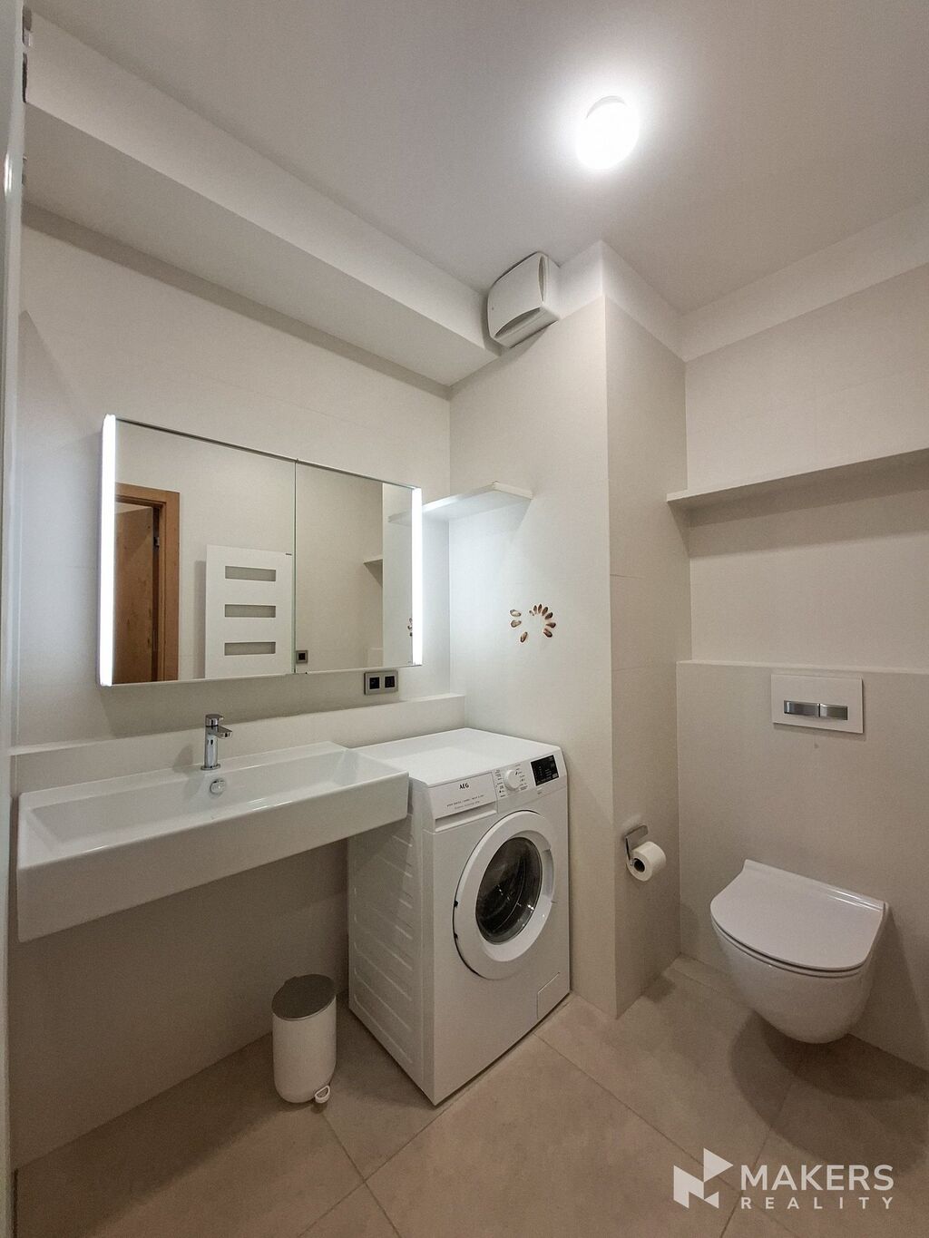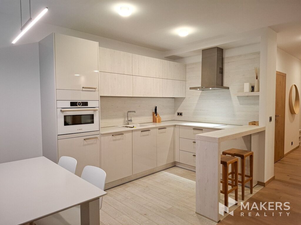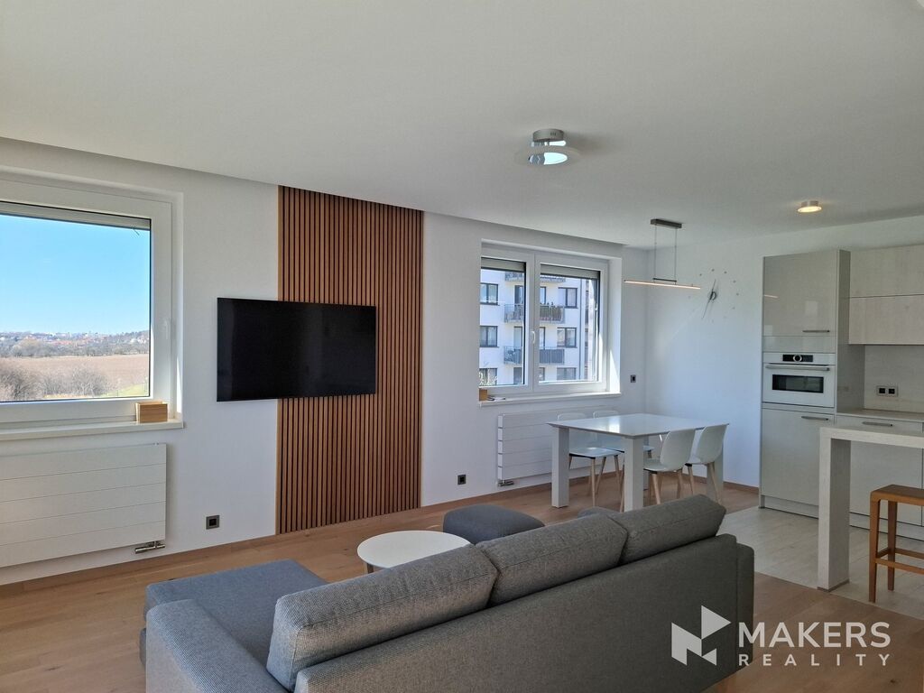 Interiér bytu je kompletně zařízen a splňuje nejvyšší standardy moderního bydlení. Kuchyňská linka německé značky SCHUELLER je plně vybavena kvalitními spotřebiči. Byt je vybaven inteligentním systémem, kterým lze pohodlně ovládat přes mobilní telefon. O příjemné vnitřní klima se postará klimatizace DAIKIN a systém rekuperace. V pokojích jsou instalovány elektrické venkovní žaluzie a na podlahách najdete kvalitní dřevěnou podlahu. Součástí bytu je také vybavená ložnice, šatna a praktická komora.