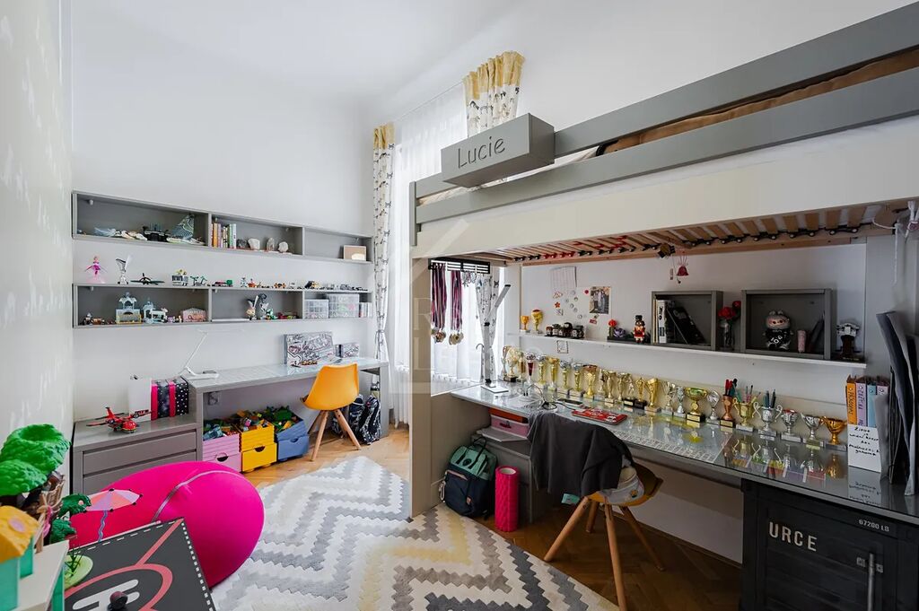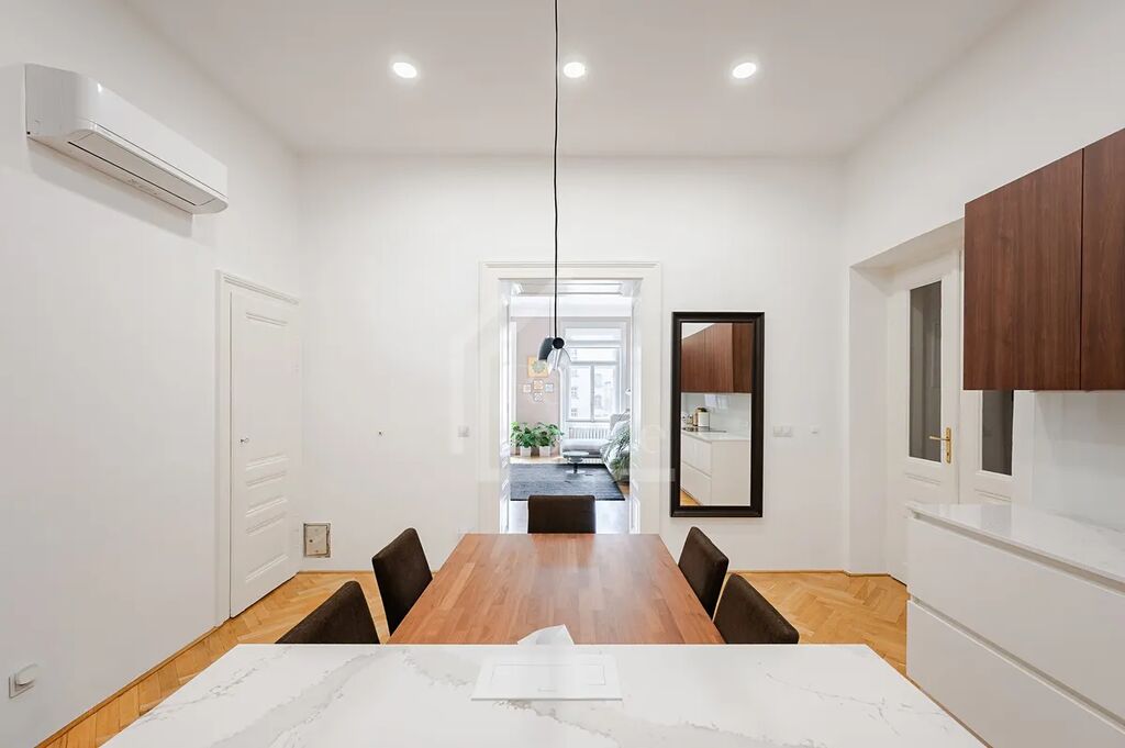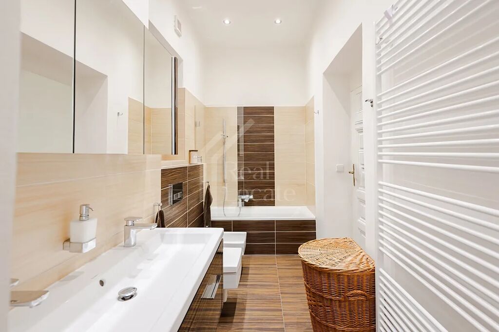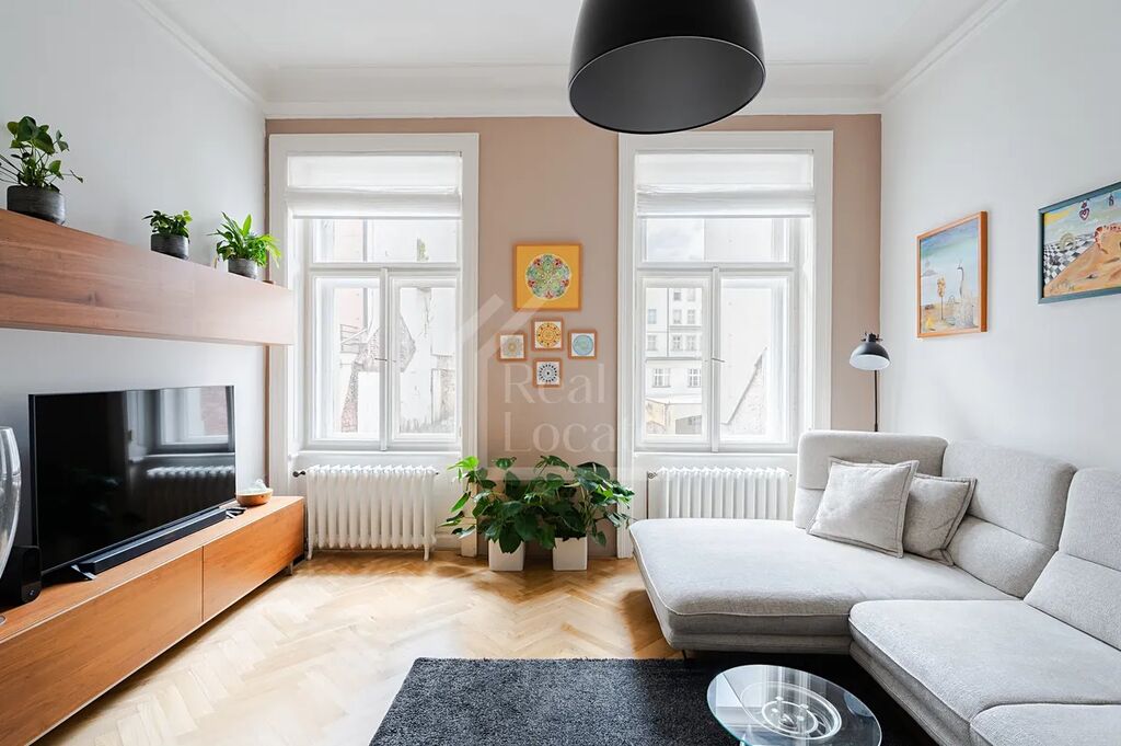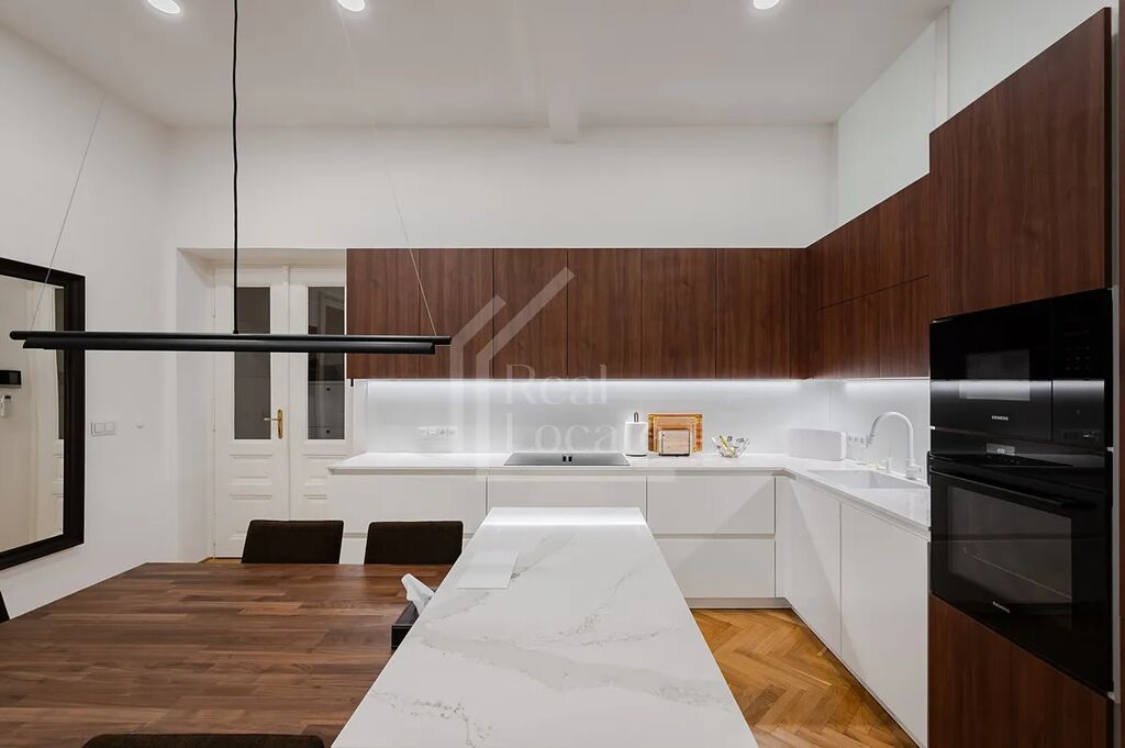Nabízíme k prodeji tento vyjímečný, moderně zařízený byt 3+1 cca (107m²) po precizní nedávné rekonstrukci, který se nachází v třetím NP cihlového domu v ulici Soukenická Praha 1 - Nové Město. Dominantou bytu je prostorný obývací pokoj zařízený kvalitním nábytkem na míru a dokonce plně funkčním krbovým vytápěním. Dále se v bytě nachází velkorysá centrální kuchyně, která právě prošla kompletní nákladnou rekonstrukcí (premiové spotřebiče i materiály). Další dvě obytné místnosti jsou zařízené jako hlavní ložnice a dětský pokoj a mají dostatek úložných prostor i místa pro početnější rodinu. Do centrální koupelny je přímý vstup z kuchyně i z hlavní ložnice a je vybavena velkou vanou se sprchovou zástěnou, umyvadlem a toaletou. Dále je v bytě druhá toaleta v technické místnosti, kde je zároveň dostatek prostoru pro pračku a sušičku. Velkou výhodou bytu je i několik klimatizačních jednotek, které se dají individuálně ovládat. Celá jednotka byla rekonstruovány s důrazem na vysokou kvalitu materiálů a provedení, jako jsou dobové dřevěné podlahy, okna a dveře i krásně zrestaurované historické radiátory. K bytu náleží velká sklepní kóje a možnost parkování ve vnitrobloku domu. Velice prestižní lokalita jen pár kroků od Náměstí Republiky. Veškerá občanská vybavenost a dopravní obslužnost v okolí.