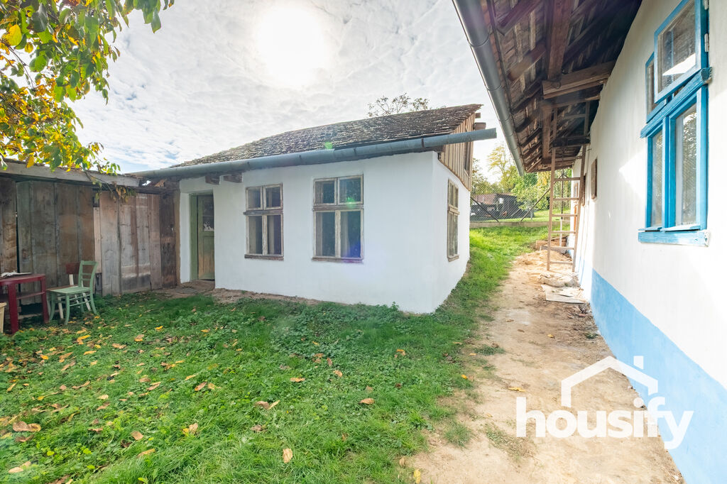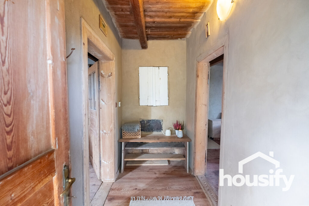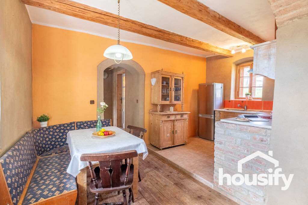 Po vstupu do domu vás uvítá útulná předsíň. Po pravé straně je vchod do ložnice s krbovými kamny a okny směrem do ulice. Z předsíně dále vejdete do obývacího pokoje s krbem. Na obývací pokoj navazuje jídelní kout s kuchyní podtrhující vesnický styl. Kuchyně je vybavena lednicí, sporákem, myčkou a okny mířícími do zahrady. Chodba z kuchyně dále pokračuje do zrekonstruované koupelny s rohovou vanou, na samostatnou toaletu a do poslední místnosti v domě, která čeká na dokončení dle vašich představ – ideální jako pracovna, pokoj pro hosty nebo ateliér.
