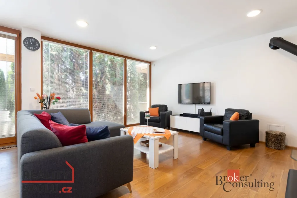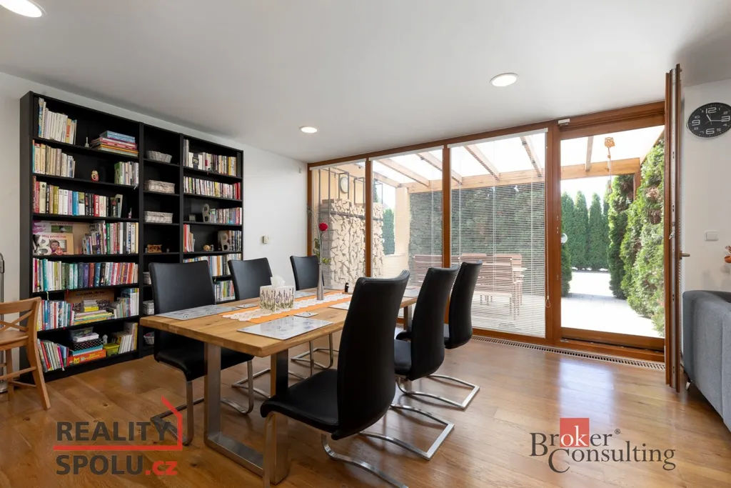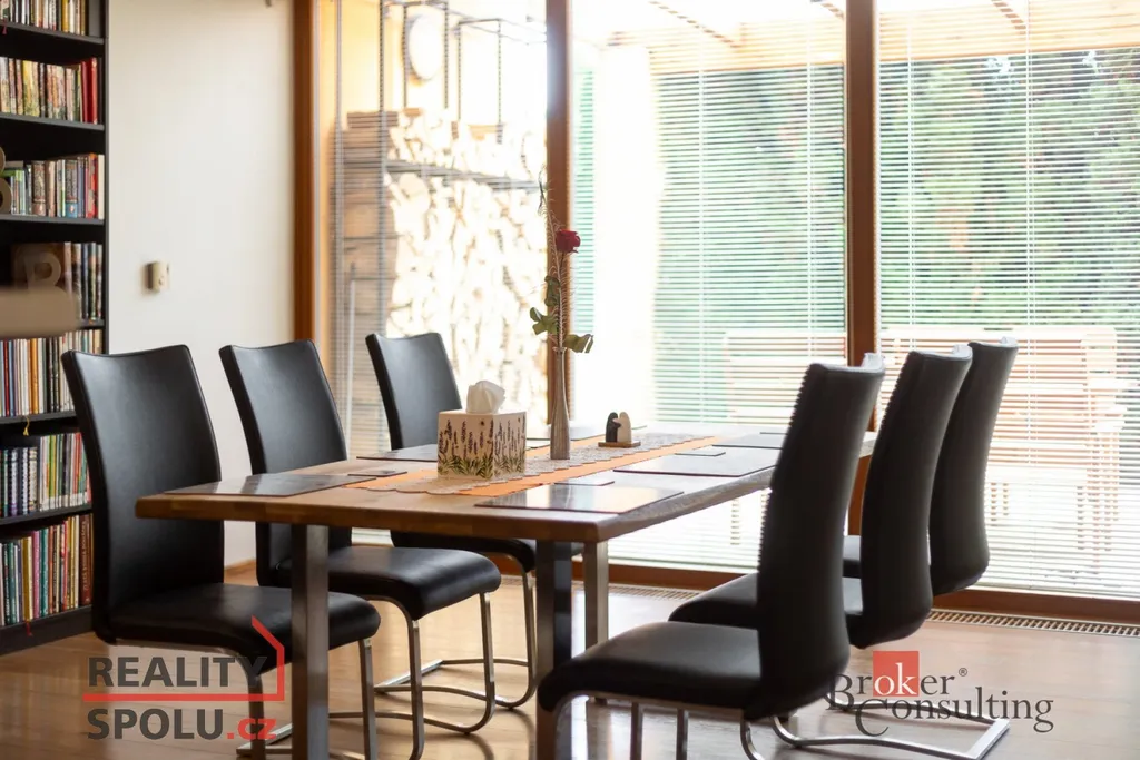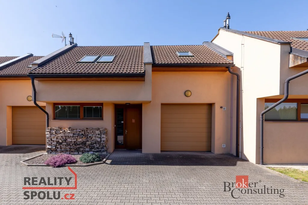 Dům je součástí trojdomku (řadovky). Část zahrady je využívána společně, další část je ve výhradním vlastnictví majitele a nabízí dostatek soukromí pro odpočinek či zahradničení. Parkování je zajištěno na pozemku před domem v uzavřeném areálu s vjezdovou bránou na dálkové ovládání, případně pohodlně v garáži, která je přímo součástí domu.