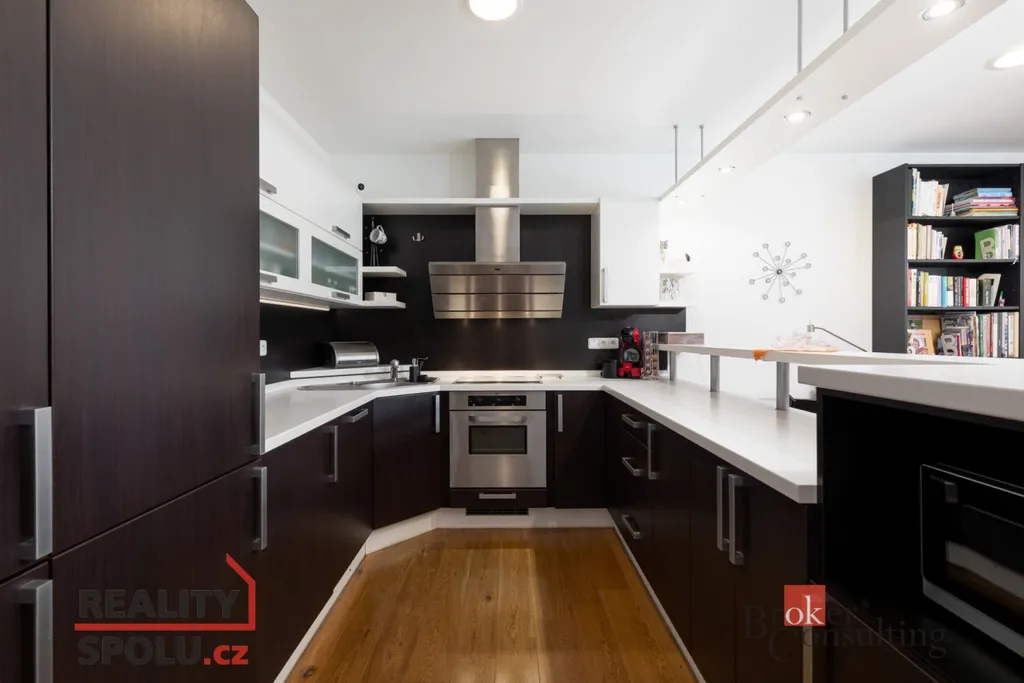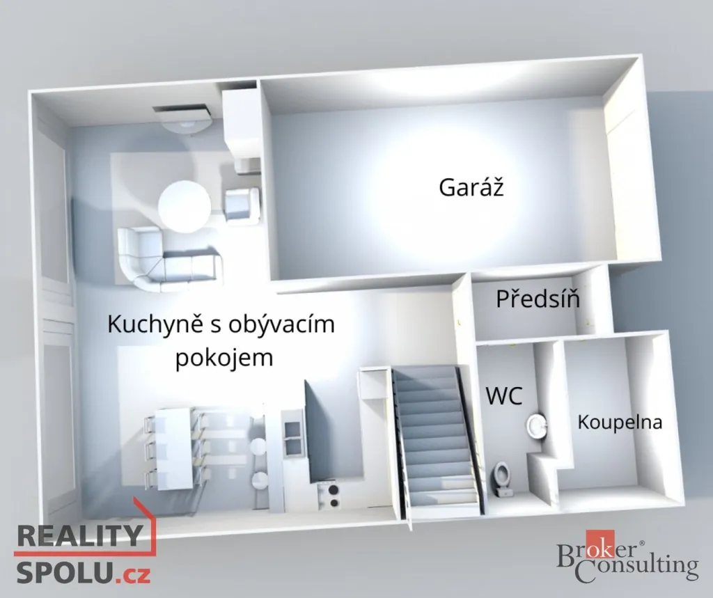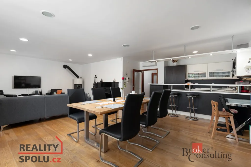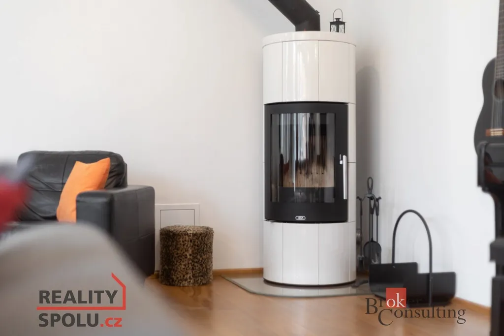 Kuchyně je plně vybavena vestavěnými spotřebiči, komfort doplňuje klimatizace LG a krb. Garáž s elektrickými vraty je přístupná přímo z předsíně, což zajišťuje maximální pohodlí. V přízemí je umístěn také plynový kotel Junkers.