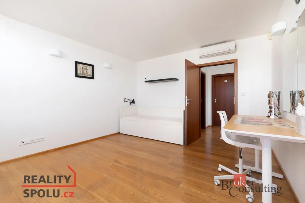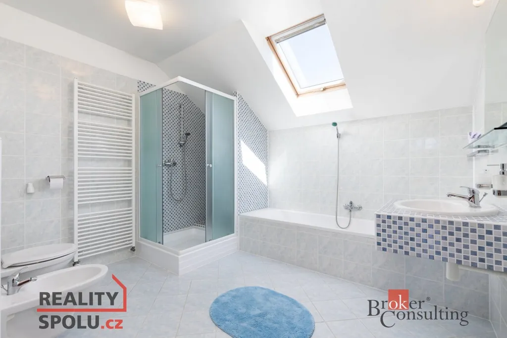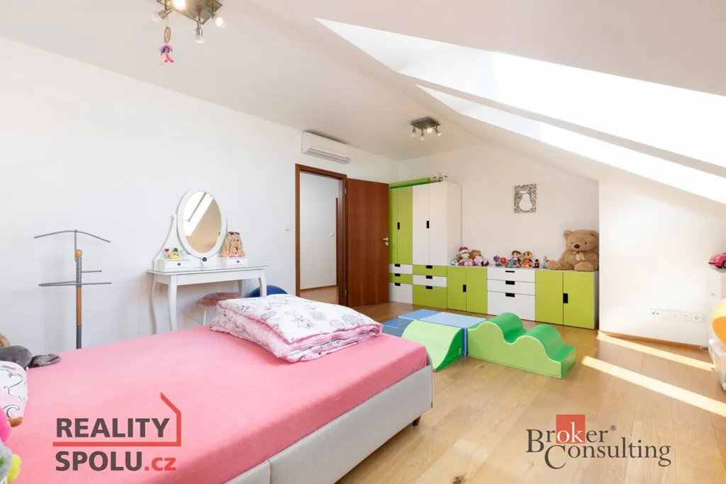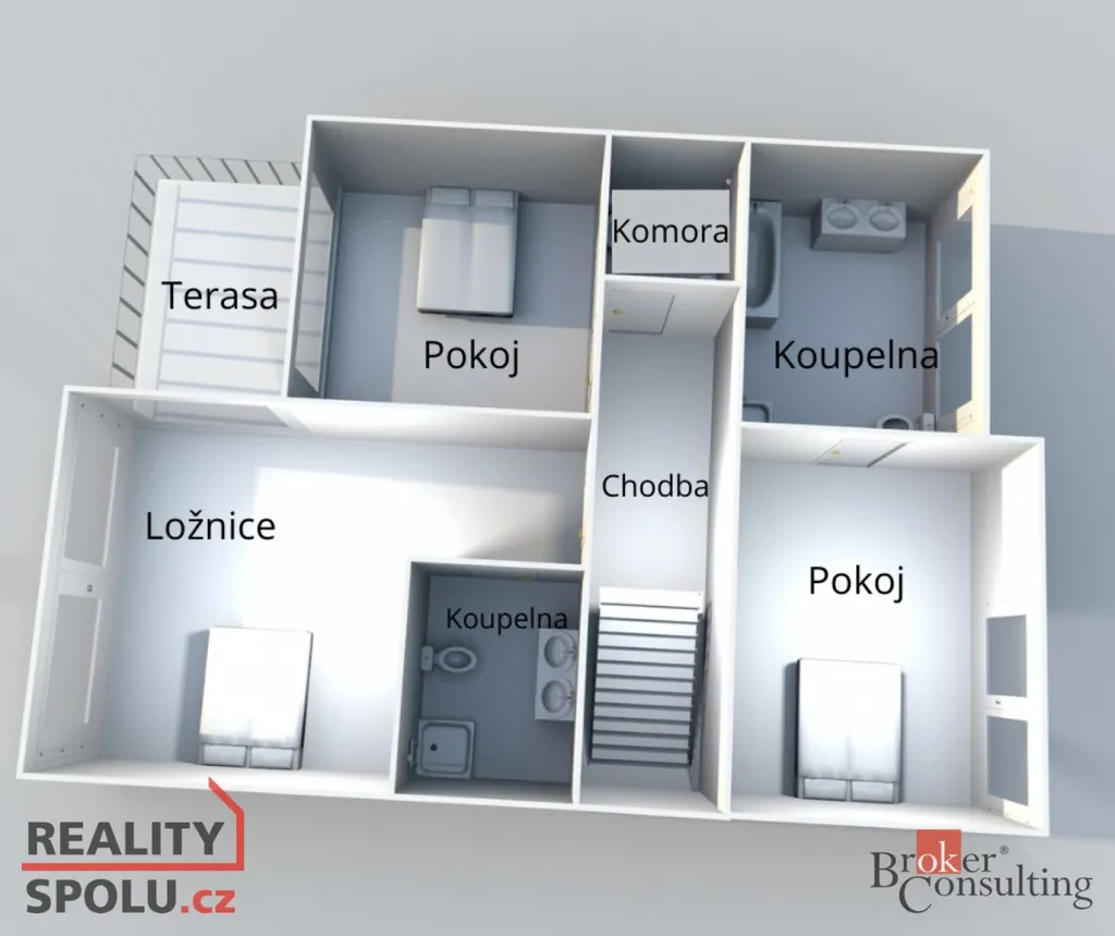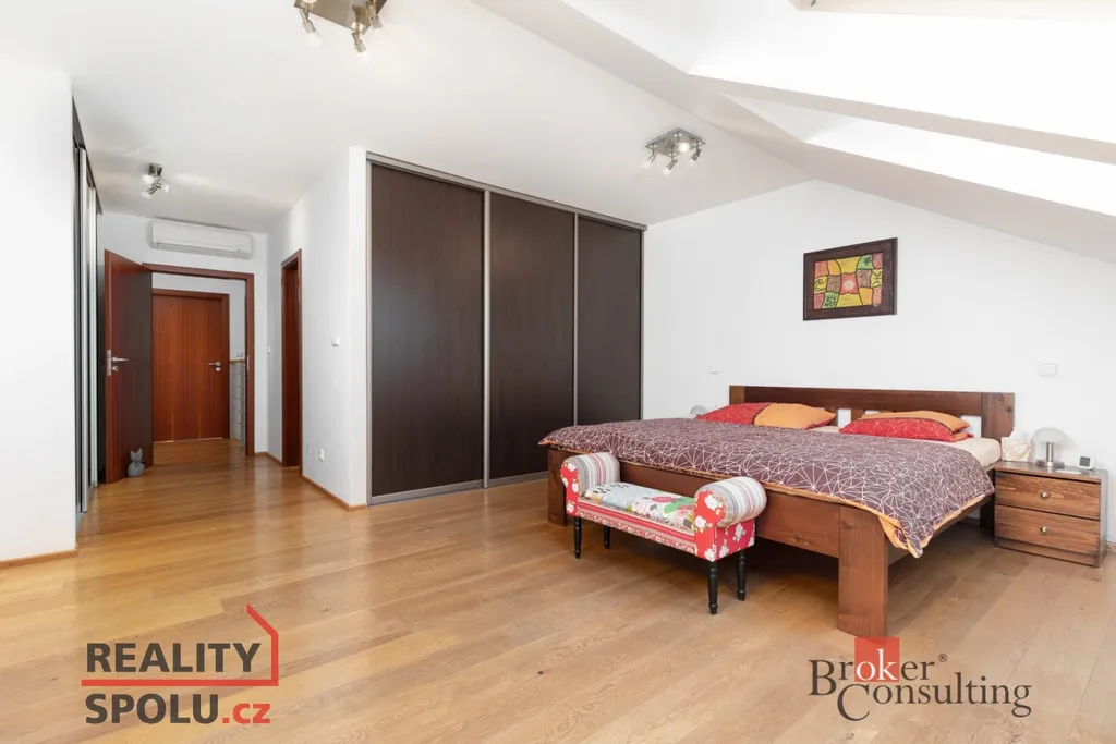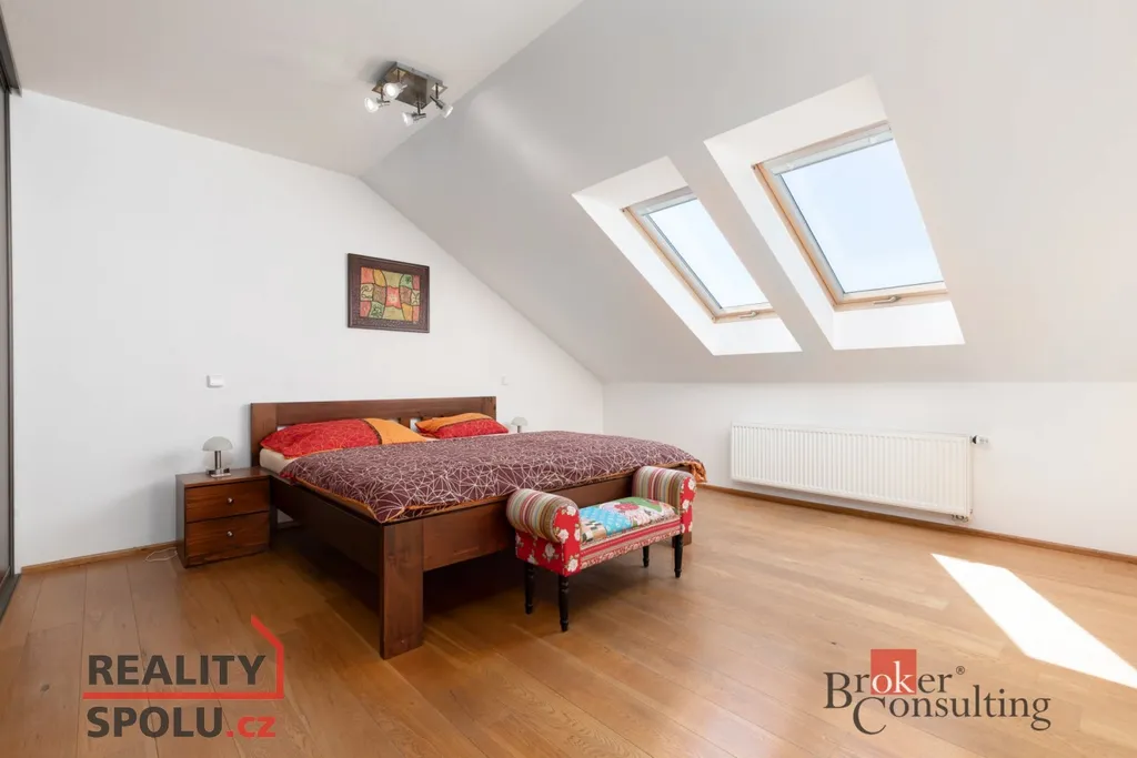 Do druhého podlaží vede elegantní dřevěné schodiště. Zde se nacházejí tři samostatné pokoje, dvě koupelny a terasa. Hlavní ložnice má vlastní koupelnu, z dalšího pokoje je vstup na terasu s výhledem do zahrady. V celém domě jsou dubové podlahy a střešní okna, která zajišťují dostatek přirozeného světla.